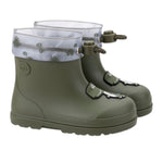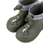 The Mendi Dino in Khaki feature playful dinosaur details and a secure drawstring cuff to keep little feet dry. Perfect for puddle jumping and outdoor adventures, they combine functionality with fun style.