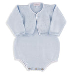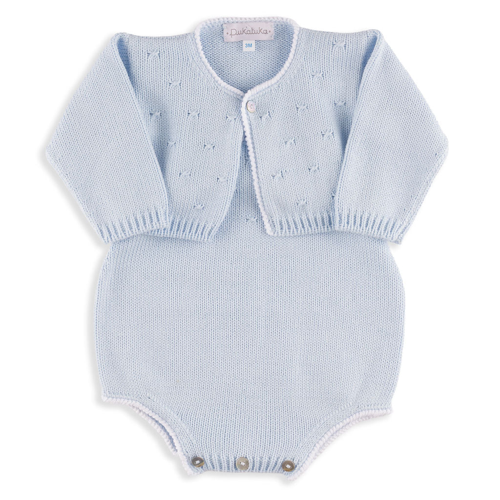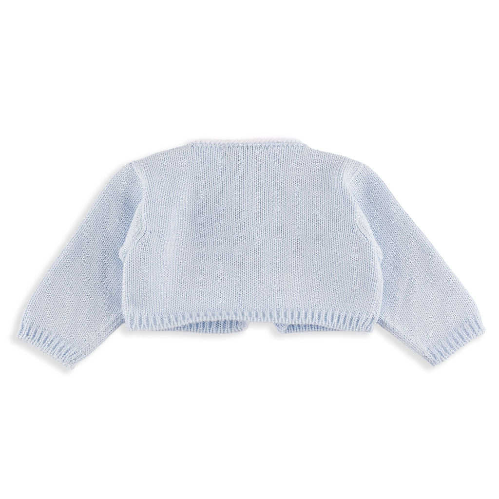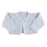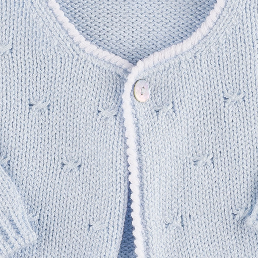 100% cotton, soft no-itch cotton, true to size. For a newborn, get the size 1M! The Wilder Cardigan in Blue offers a classic, cozy layer with its soft knit and timeless silhouette. Its cool blue hue adds a refined touch, making it an easy staple for everyday outfits and special moments alike.