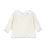 This elegant two-piece Ivory Knit Set with Blue Trim features a soft cream knit top with delicate diamond patterns, scalloped hem, and a crisp white Peter Pan collar trimmed in light blue. Paired with matching footed pants, it offers both comfort and timeless charm for little ones.