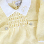 Gorgeous knitted butter yellow romper with a collar -- it is a classic silhouette that will be a staple in any baby's closet. True to the Bea Colette brand DNA, we love that this romper achieves both polished and practical. This romper runs true to size.