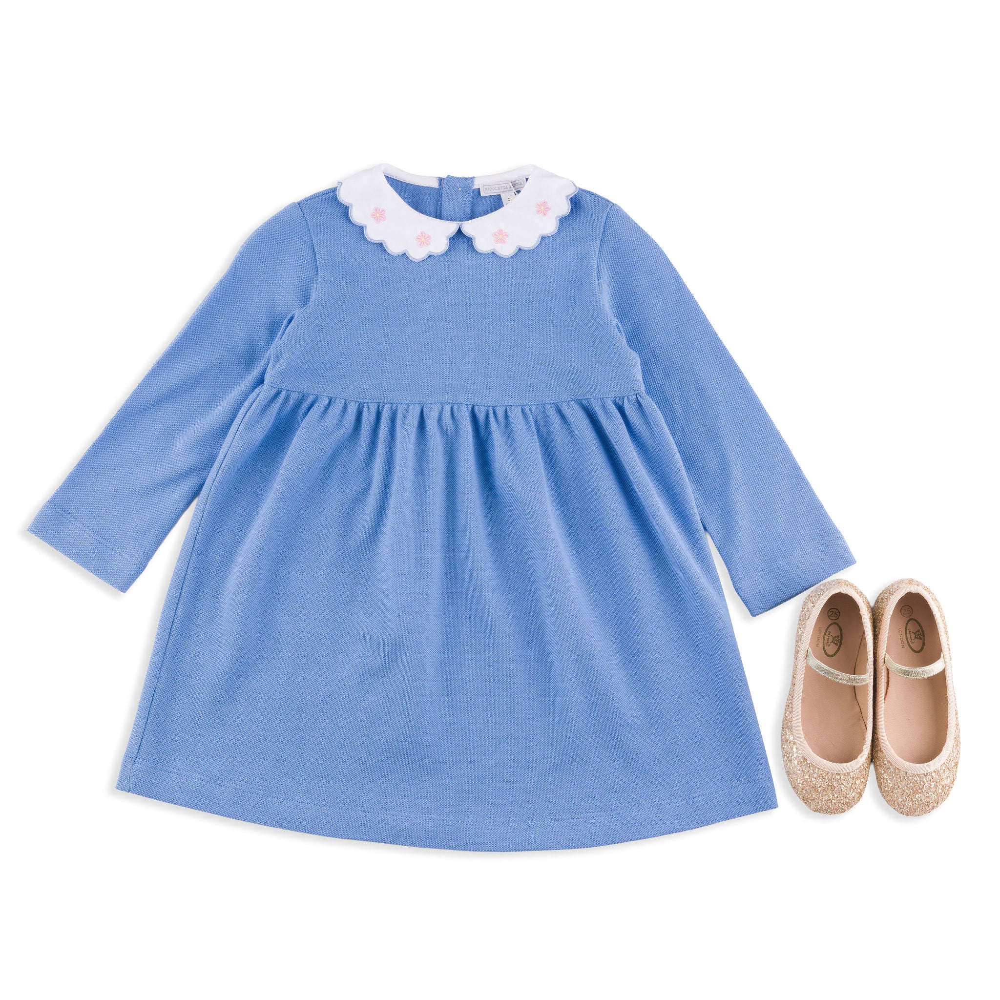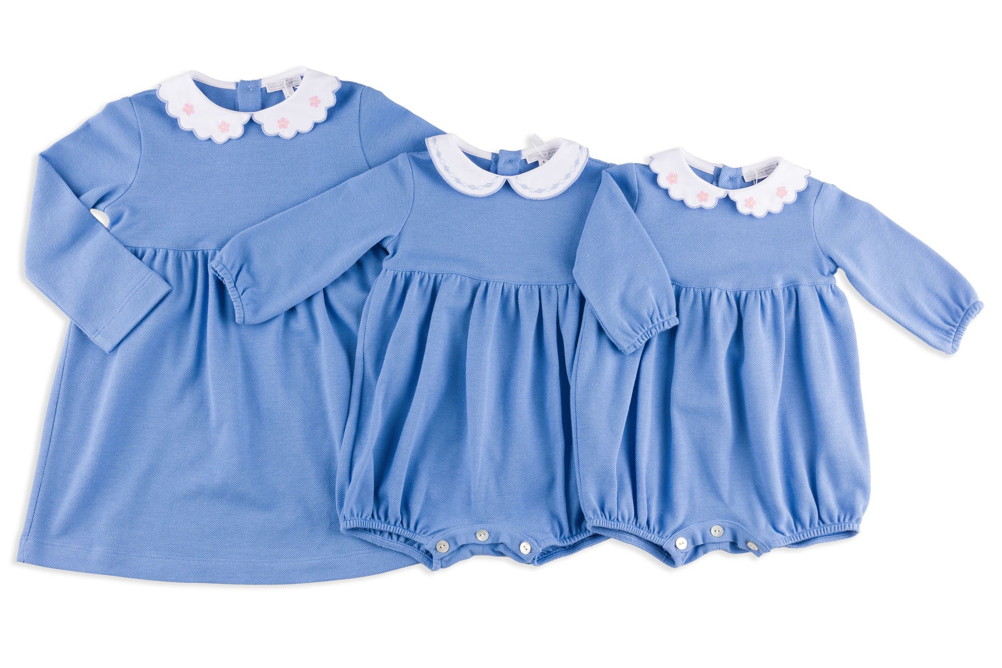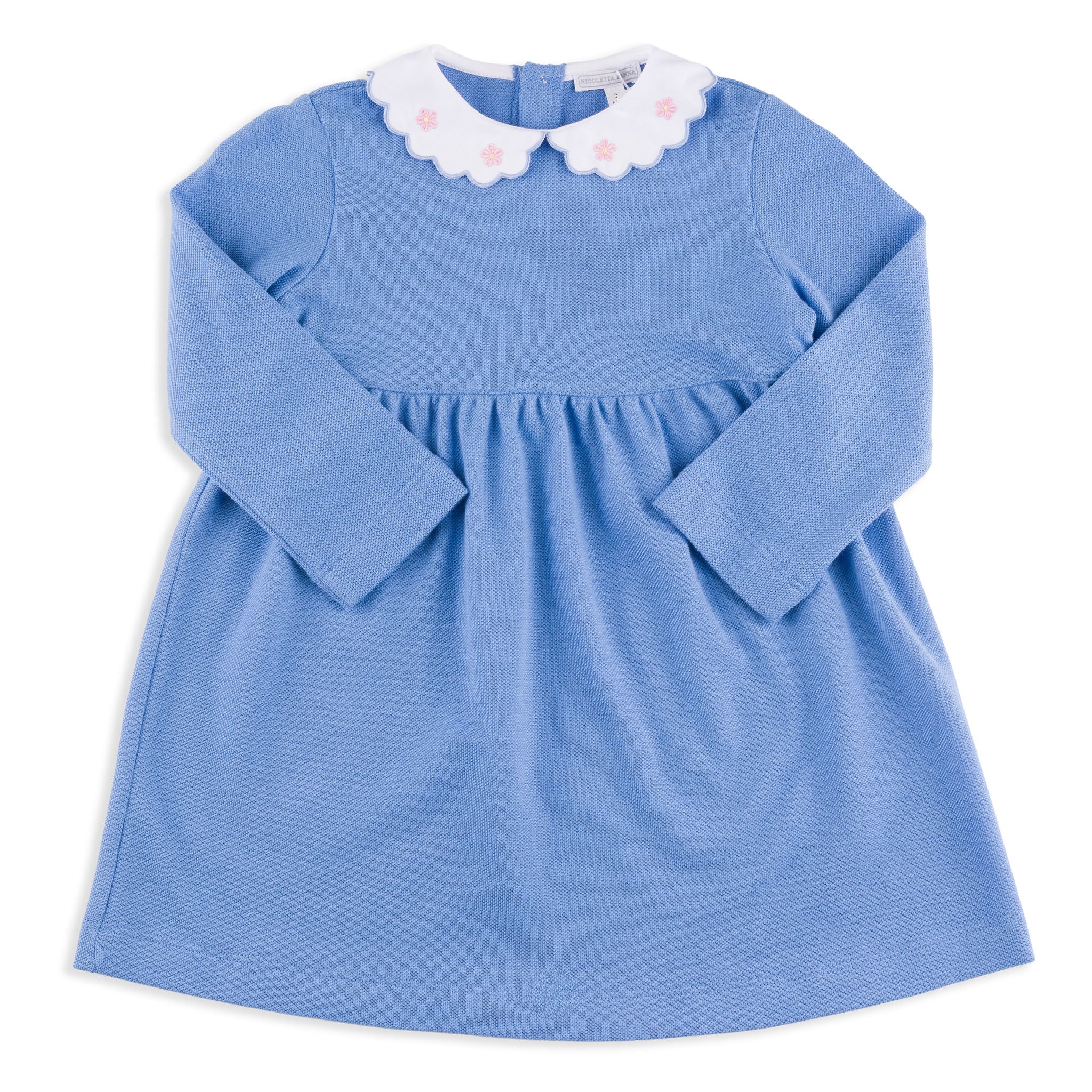 Sylvie Blue Pique Dress with Pink Daisy Embroidered Collar