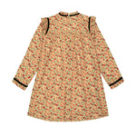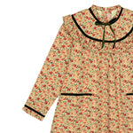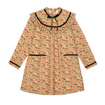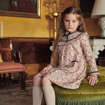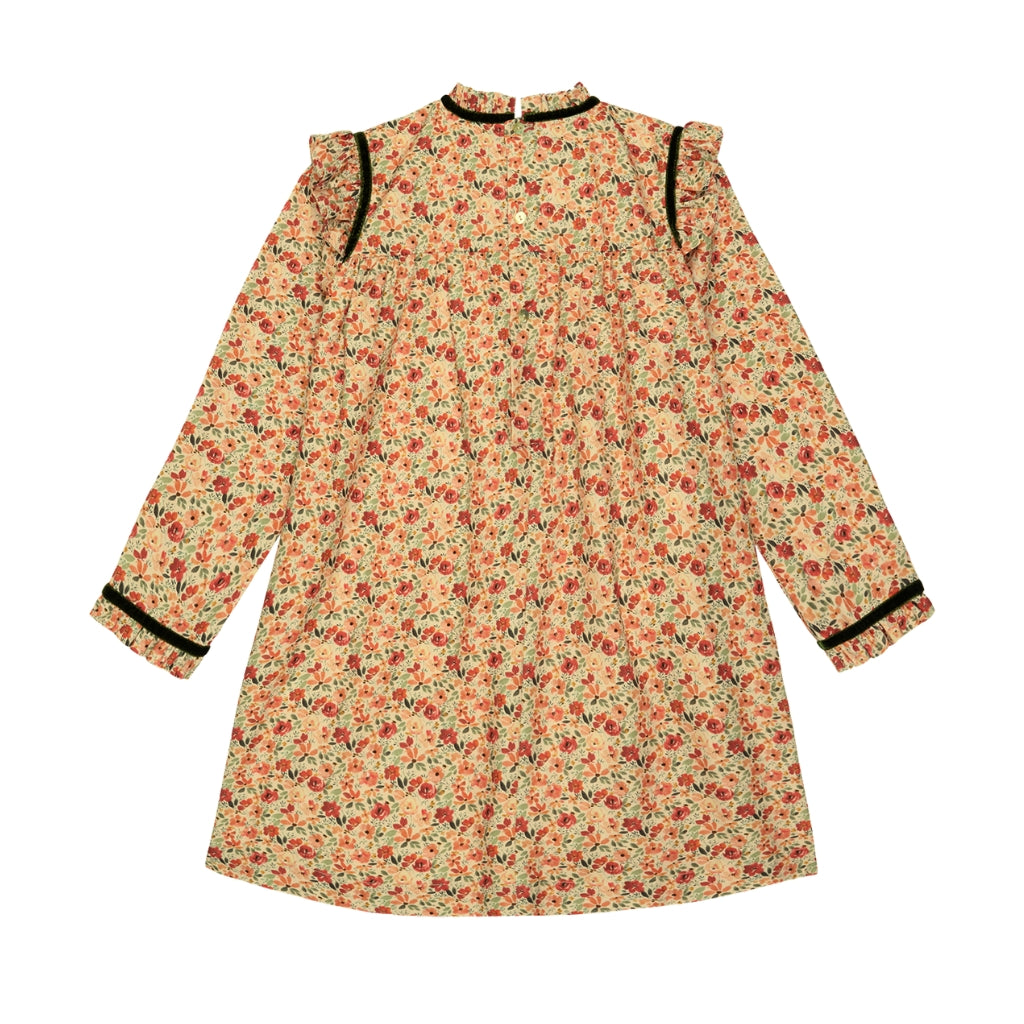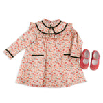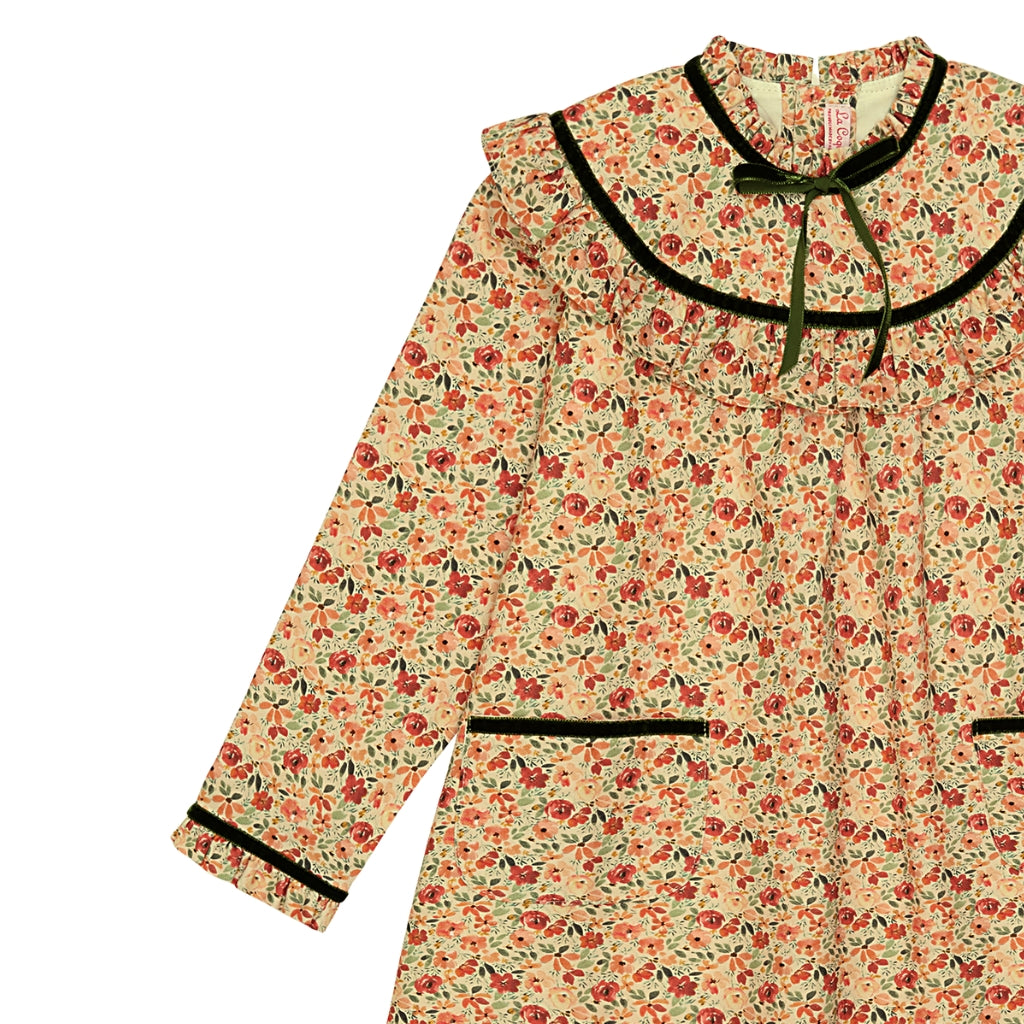This gorgeous dress is made of 100% cotton. This garment runs small; we recommend sizing up for the perfect fit. If the child is in between ages we recommend purchasing the next age up for the perfect fit.