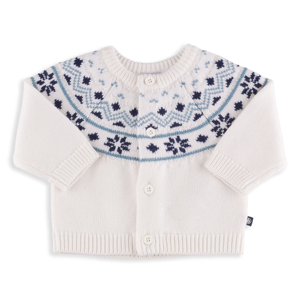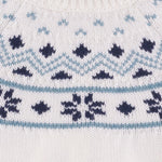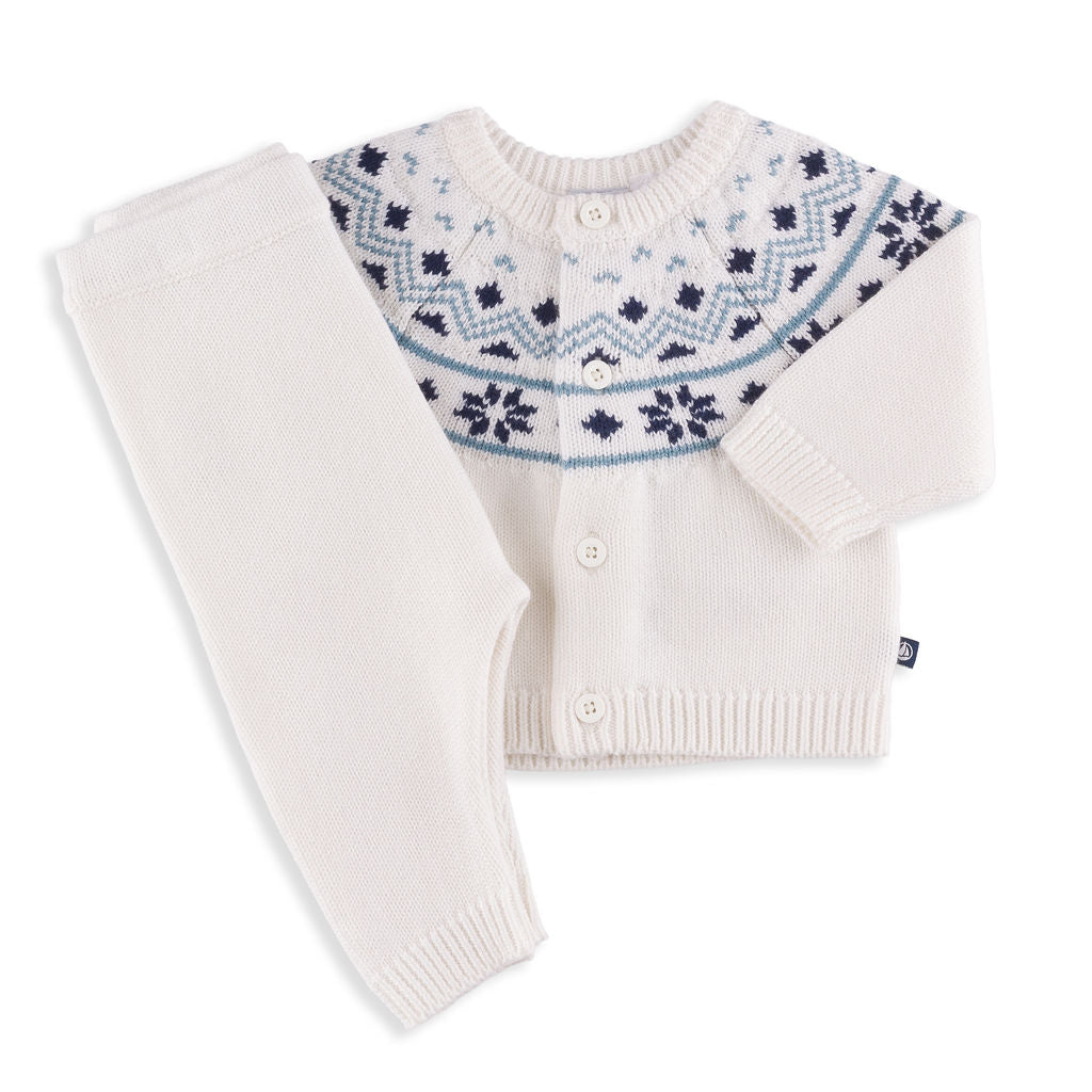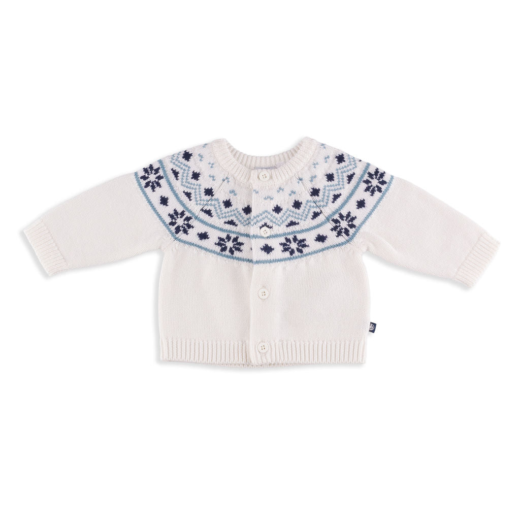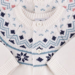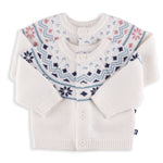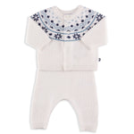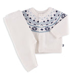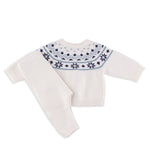This cozy knit set features a cream cardigan adorned with a classic Nordic-inspired navy and blue pattern across the yoke. Paired with matching knit pants, it's the perfect ensemble to keep your little one warm and stylish during chilly days.