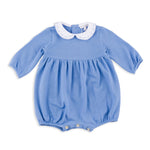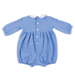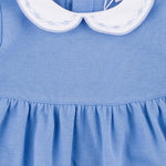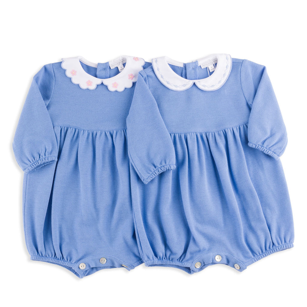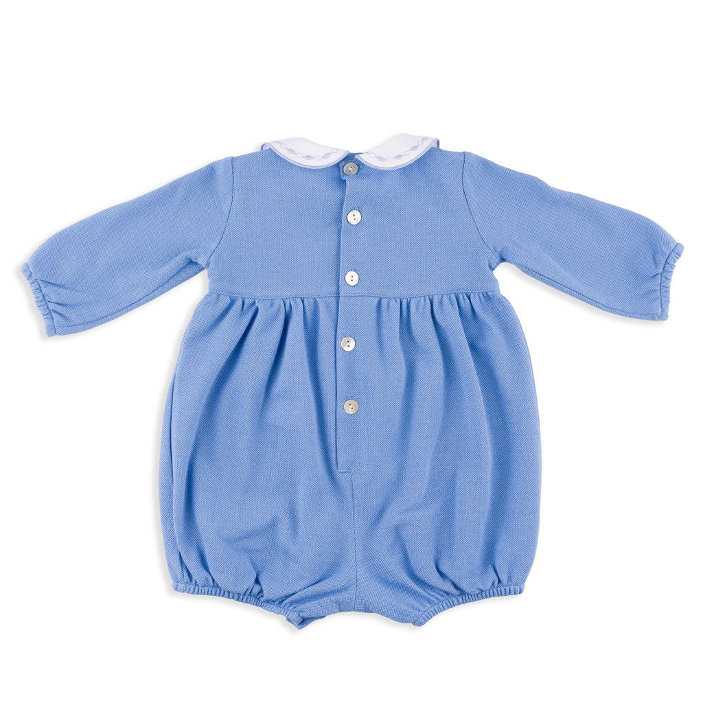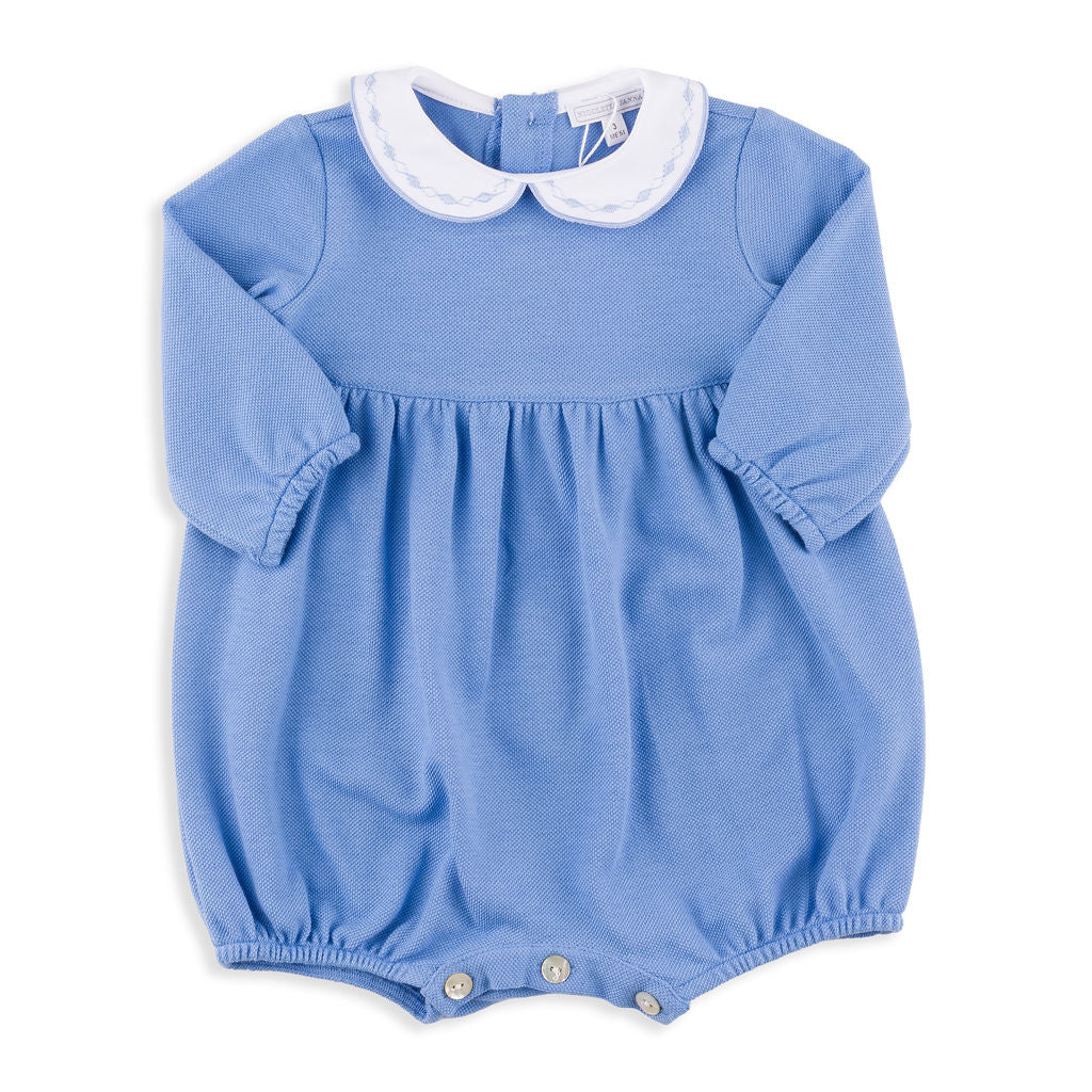 Runs true to size/slightly generous. The Rocky Romper with Blue Collar features a tonal blue-on-blue design, highlighted by intricate embroidery in two shades of blue for a subtle yet elegant contrast. This refined romper blends soft comfort with delicate detailing, making it a versatile and timeless wardrobe piece.