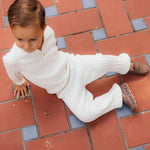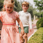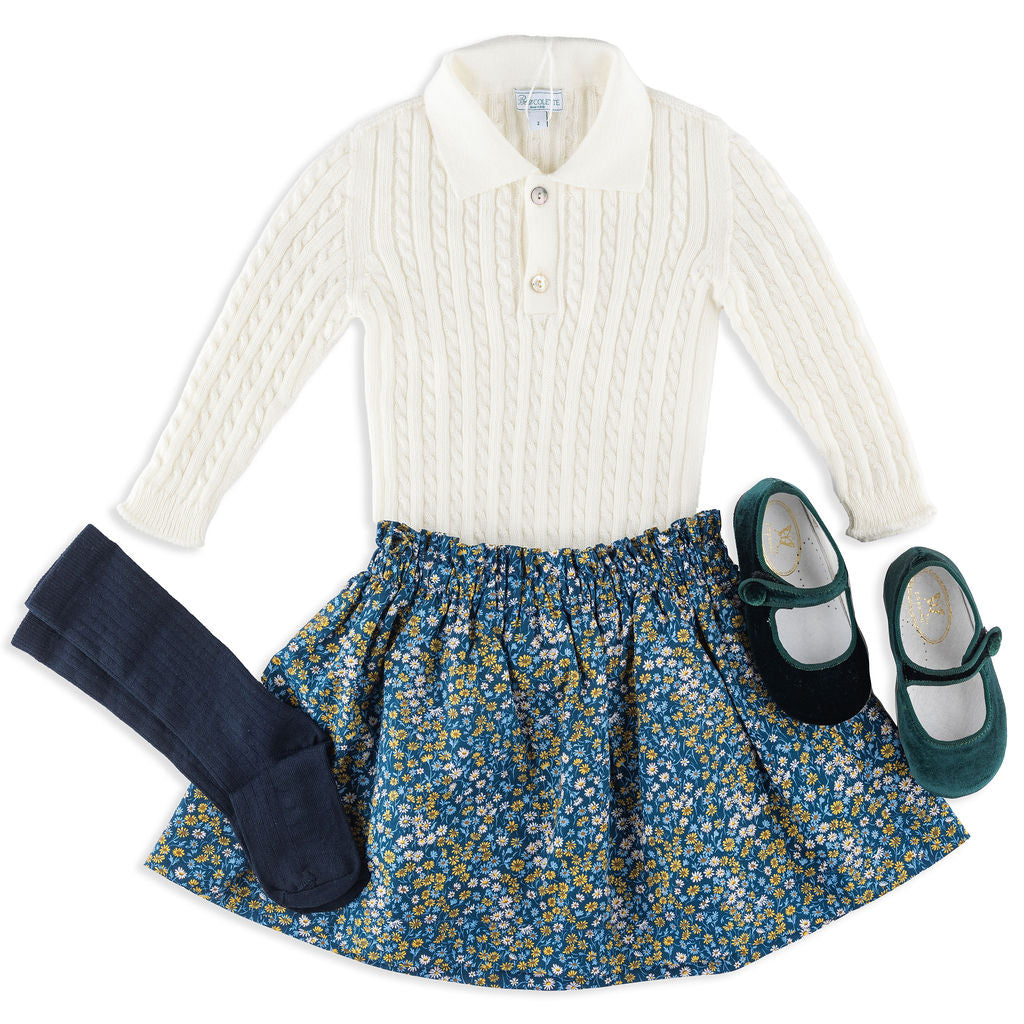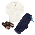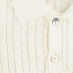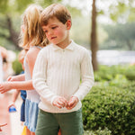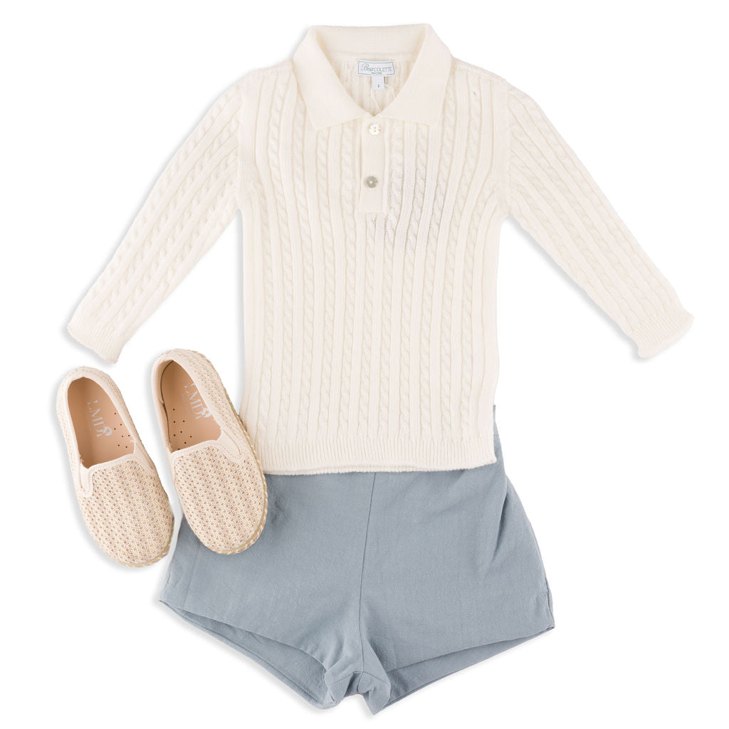 Fit & Design Details: Please note this style runs small in length. If your child is taller, we recommend sizing up. Available in classic Ivory and Sage Green, the Como was initially designed for little boys but is equally suited for girls. It features a narrow cable-knit design with a polo collar, rib-knit wristbands + hem, and a two-button placket. During colder months, style it with corduroy pants, joggers, loafers or sneakers for boys, or pair it with skirts, ribbed tights, and Mary Janes for girls. In warmer seasons, it pairs effortlessly with shorts or skirts. From winter to summer, playtime to dinner, this piece fits seamlessly into any occasion. True to US sizing, we recommend ordering your child’s usual size. Our knitwear collection is available in sizes 12 months to 8 years. Every design includes a subtly embroidered BC logo, adding a discreet, playful touch. Each piece is handmade by artisans, so no two products will be exactly alike, adding to their unique charm.