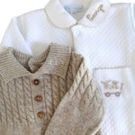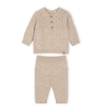 This Oatmeal Knit Set includes a cozy long-sleeve sweater with a cable-knit detail and wooden buttons, paired with matching soft pants. Perfect for everyday wear or special outings, it offers both comfort and timeless style.