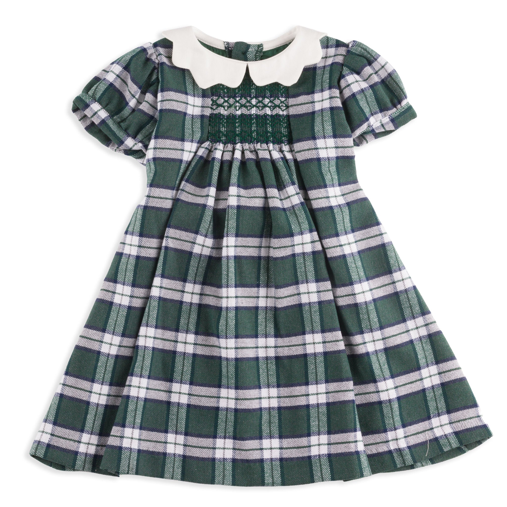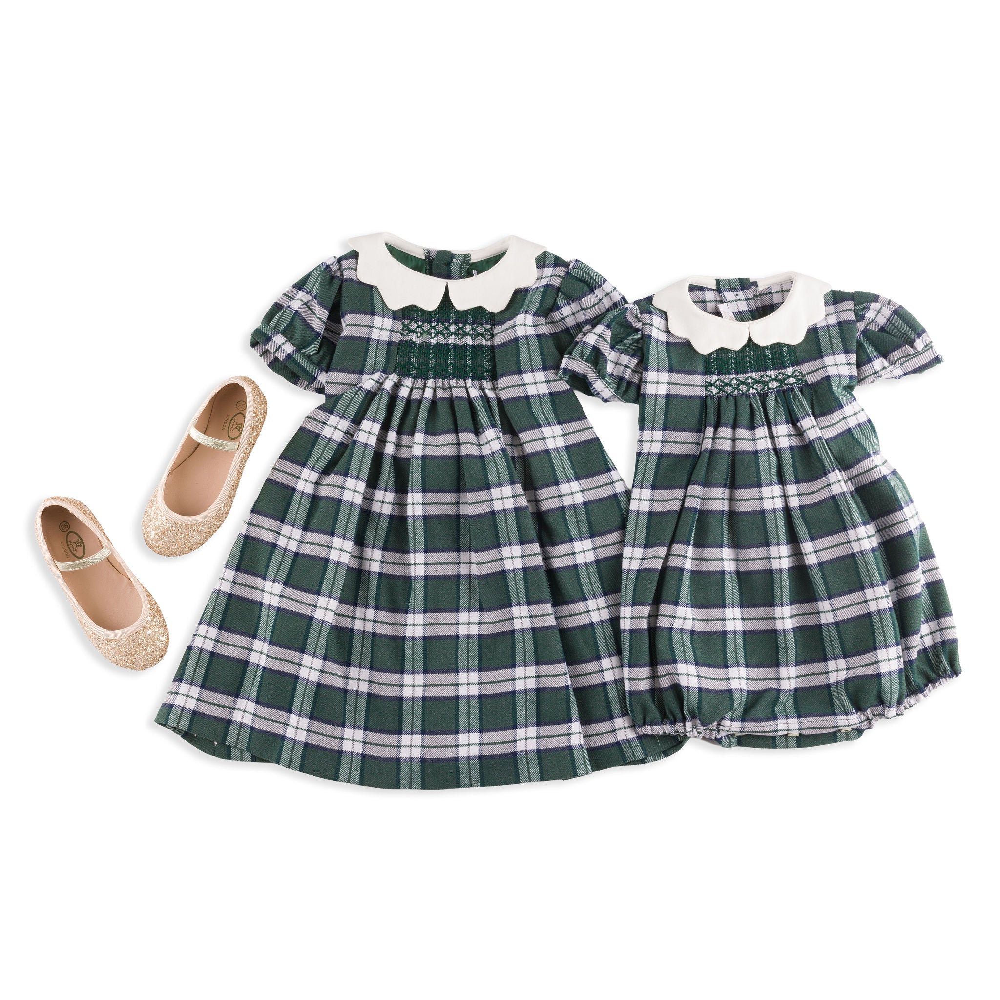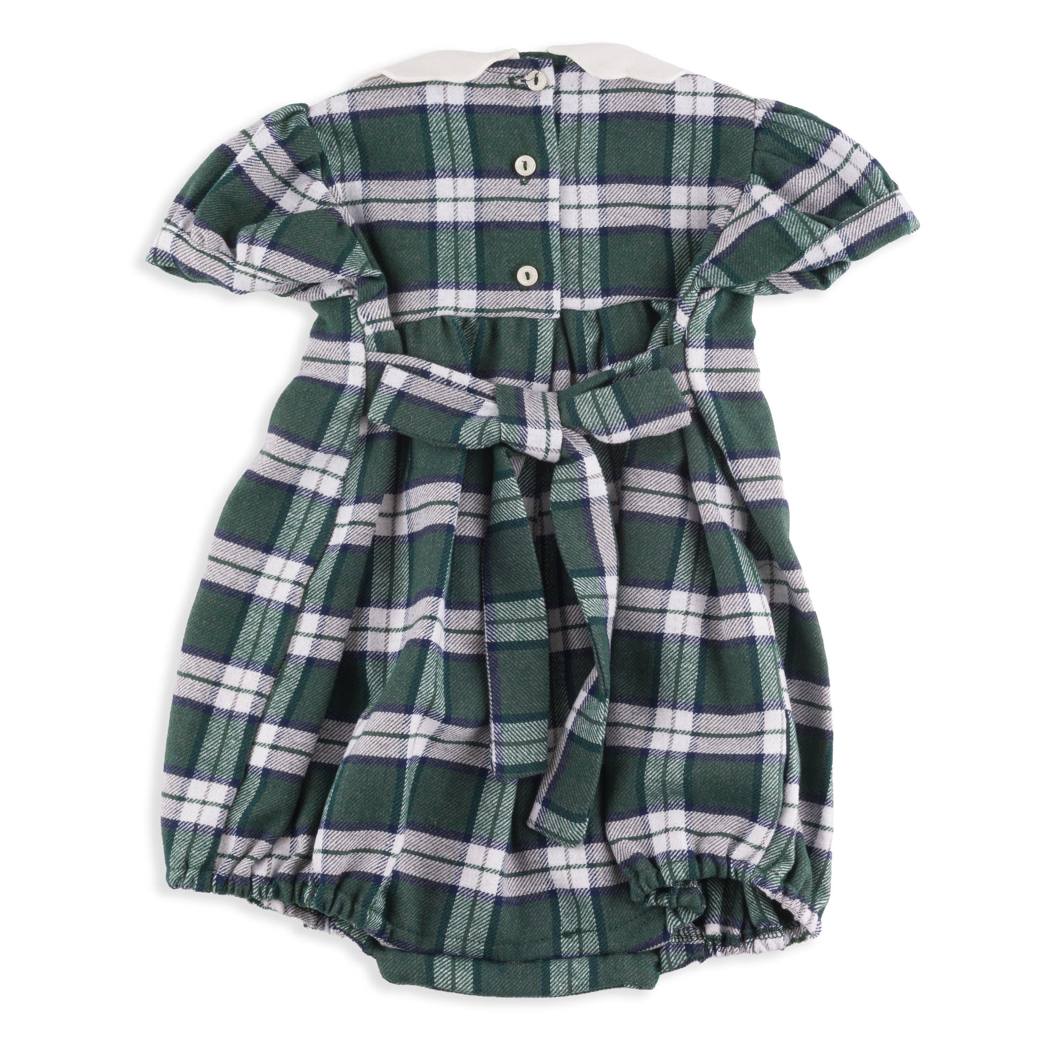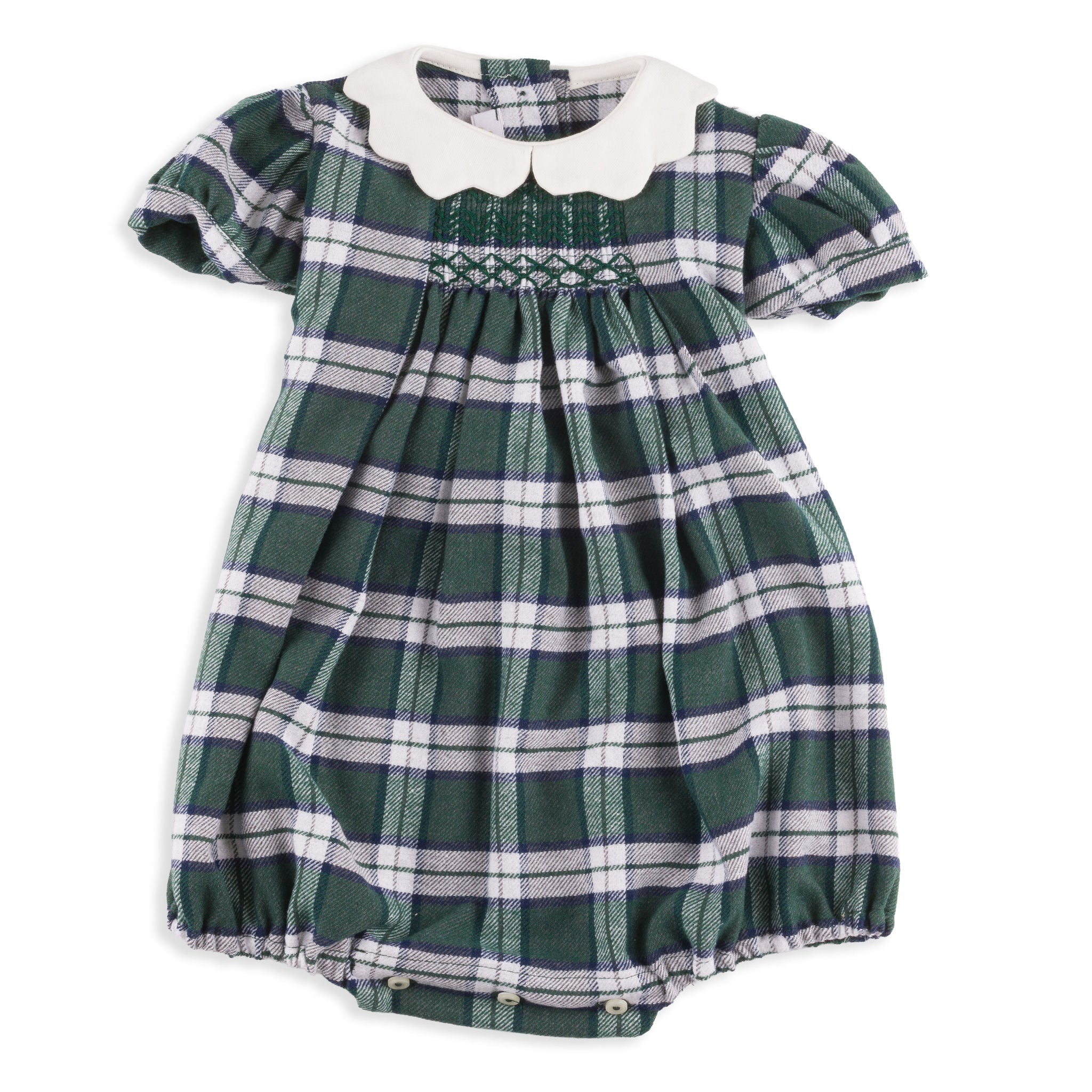 The Emmy Green and Navy Tartan Holiday Romper blends classic sophistication with cozy charm, featuring a gorgeous tartan print, collar, and smocking. Perfect for special occasions or stylish everyday wear, it offers both comfort and timeless appeal.