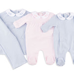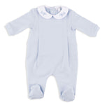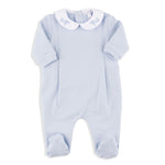The Ginepro Romper in blue features a soft, cozy body accented by the collar in light blue for a refined, gentle contrast. Designed for comfort and charm, it’s perfect for everyday wear with a touch of elegance.