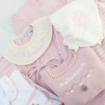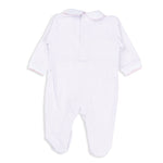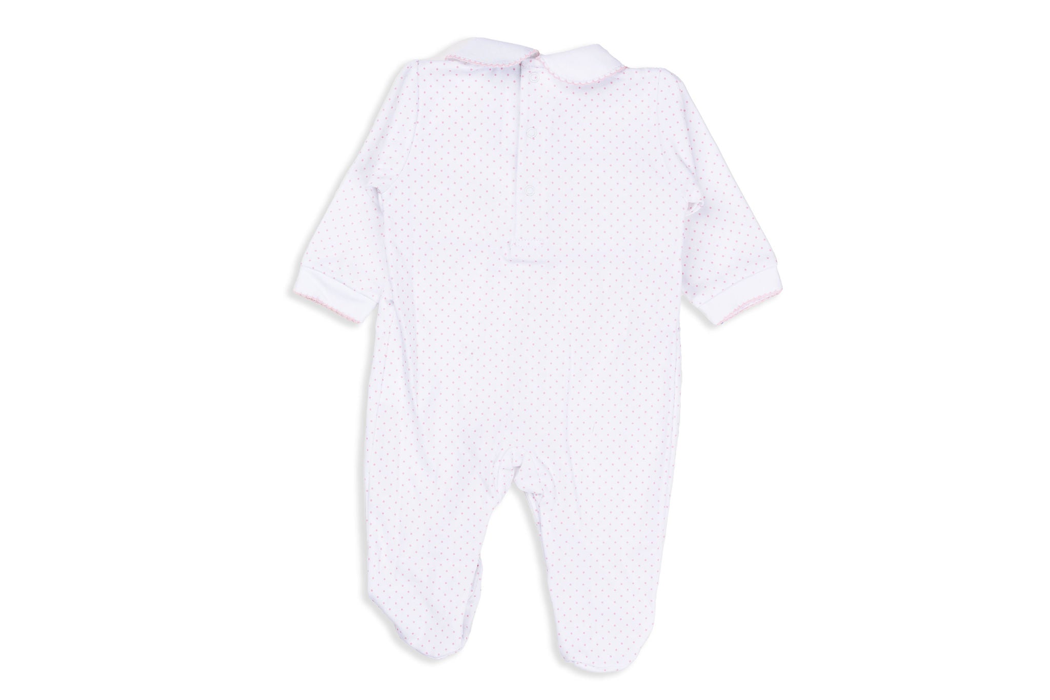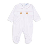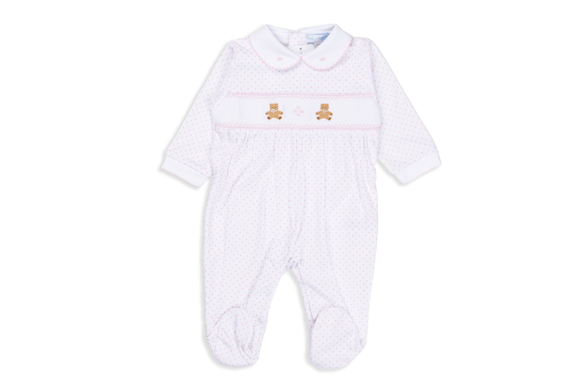 This beautiful footsie is the perfect combination of elegance and luxury. Crafted from the most luxurious pima cotton, this sleepsuit is exquisitely hand smocked and adorned with classic Nursery Bear embroidery and details on the peter pan collar. Opens with poppers and the back and between the legs.