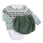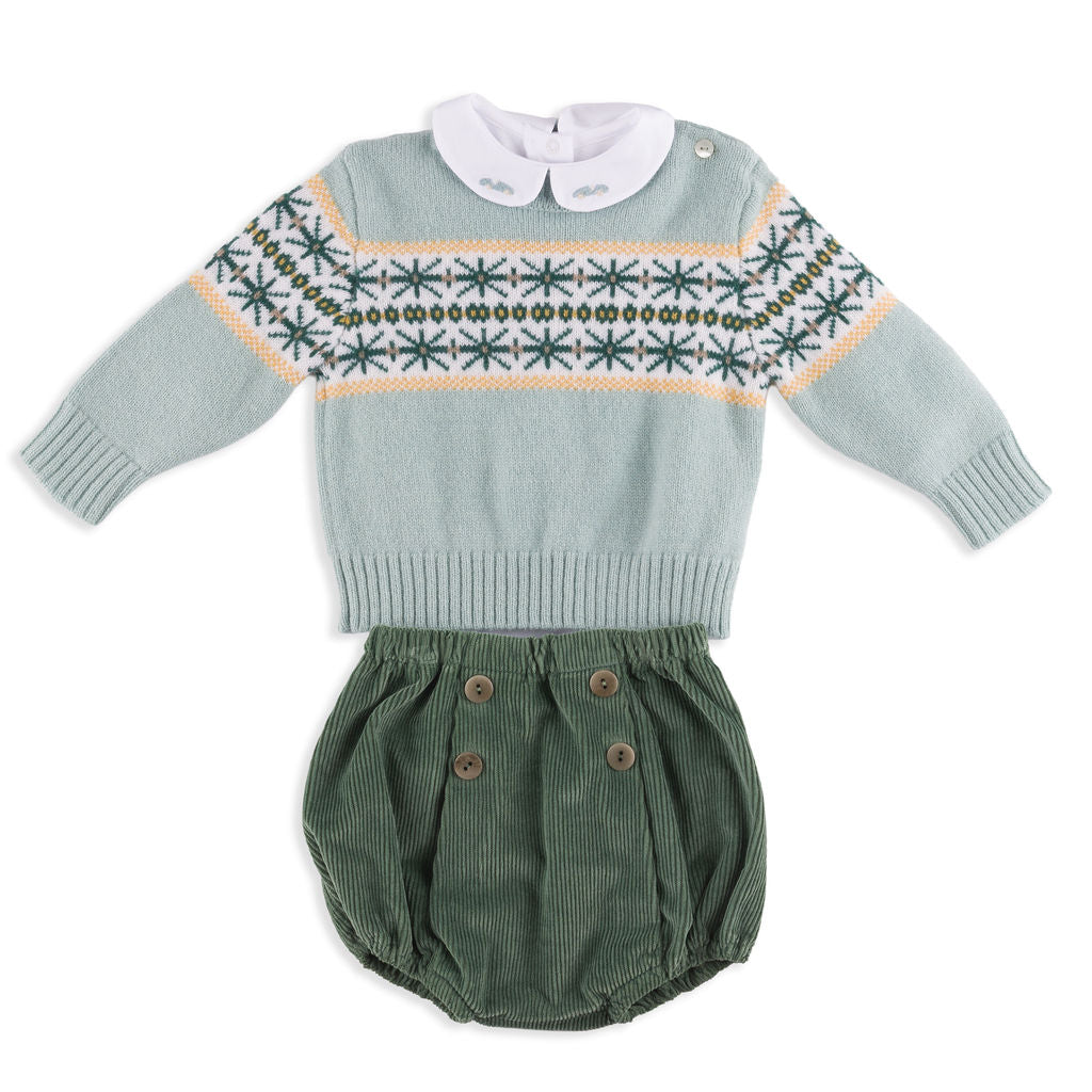 This soft knit sweater features a charming jacquard pattern in shades of navy, green, and mustard against a soothing light blue base. Complete with shoulder buttons for easy dressing, it's a cozy and stylish essential for chilly days.