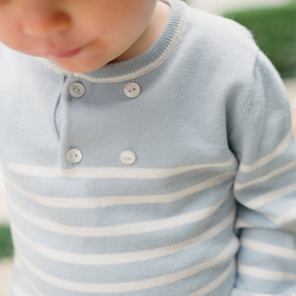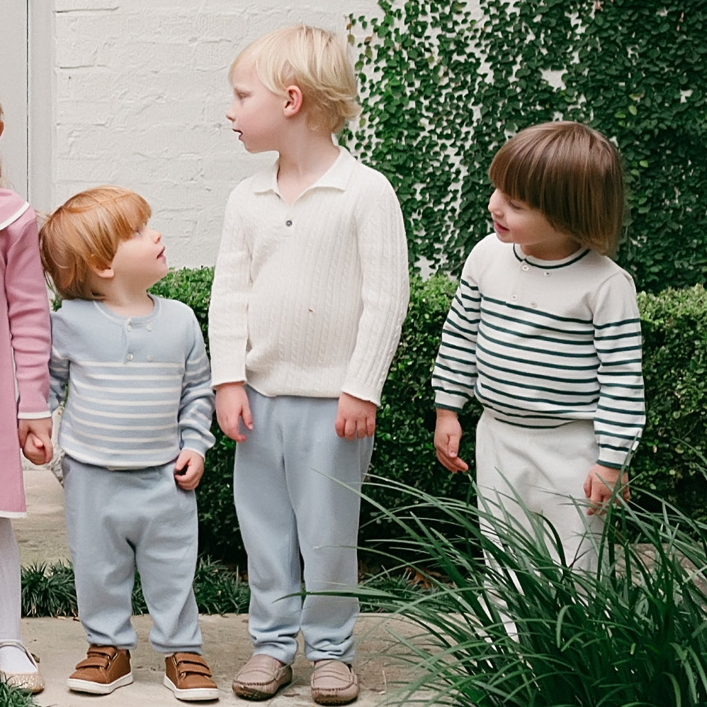 Fit & Design Details: The Lucerne runs true to US sizing, but if your child is in between sizes, we recommend going up one size for longer wear. Perfect for any occasion, the Lucerne transitions effortlessly from playground to dinner, pairing well with sneakers or loafers. The classic, crew-cut sweater and joggers can mix and match with wardrobe staples or Bea Colette favorites like the Ravello cardigan or Como cable sweater. Lightweight yet cozy, it’s ideal for summer evenings or layered during winter. Inspired by founder Meghan’s favorite knit sets for traveling and The Parent Trap's Camp Walden colors, the Lucerne combines timeless style and comfort. True to US sizing, it’s available for ages 12 months to 8 years. Every design includes a subtly embroidered BC logo, adding a discreet, playful touch. Each piece is handmade by artisans, so no two products will be exactly alike, adding to their unique charm.