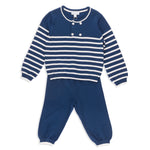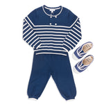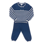 Meet the Lucerne Set – a sleek, soft, and versatile two-piece set that embodies the charm of Italian craftsmanship and technology – it represents our love for elevated Italian knitwear. Expertly knit in Tuscany from 100% premium cotton, the Lucerne features striped sweater detailing and contrast piping on jogger-style pants. Available in evergreen/ivory, emerald green and slate blue, slate blue/ivory, key lime/blue, celestial light blue/sapphire stripe, ivory/sky blue, green/blue, and of course this beautiful navy/ivory, it’s designed for all-year wear and suitable for both genders.