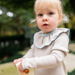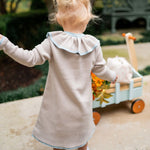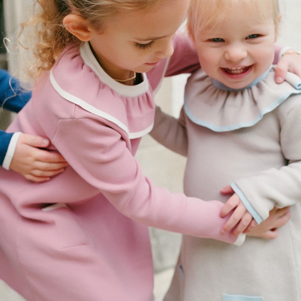 Fit & Design Details: The Marais runs true to US sizing, but if your child is in between sizes or on the taller side, we recommend going up one size for longer wear. Available in rose/ivory, navy/ivory and sandstone/ice blue, the Marais is suitable for year-round wear on little girls 12 months to 8 years. Its A-line style intended to hit just above the knee accommodates all little girl body types. Minimalistic in style but sweet and childlike with the mini pockets and ruffle collar, the Marais pairs effortlessly with anything from sneakers, to Mary Janes, to boots, and beyond. The piping contrast makes for an eye-catching detail. Every design includes a subtly embroidered BC logo, adding a discreet, playful touch. Each piece is handmade by artisans, so no two products will be exactly alike, adding to their unique charm.