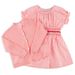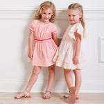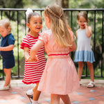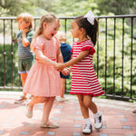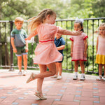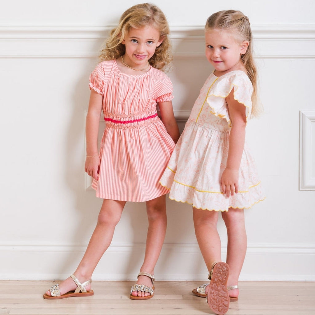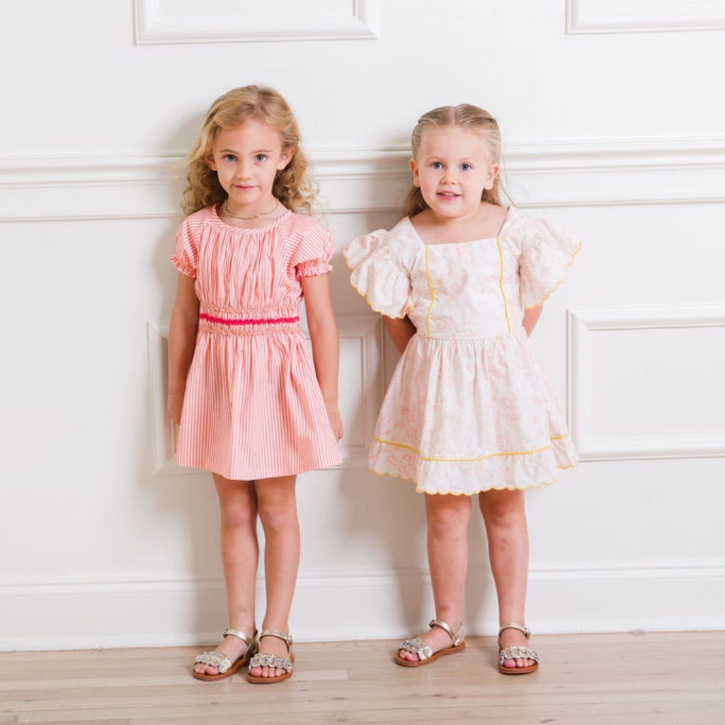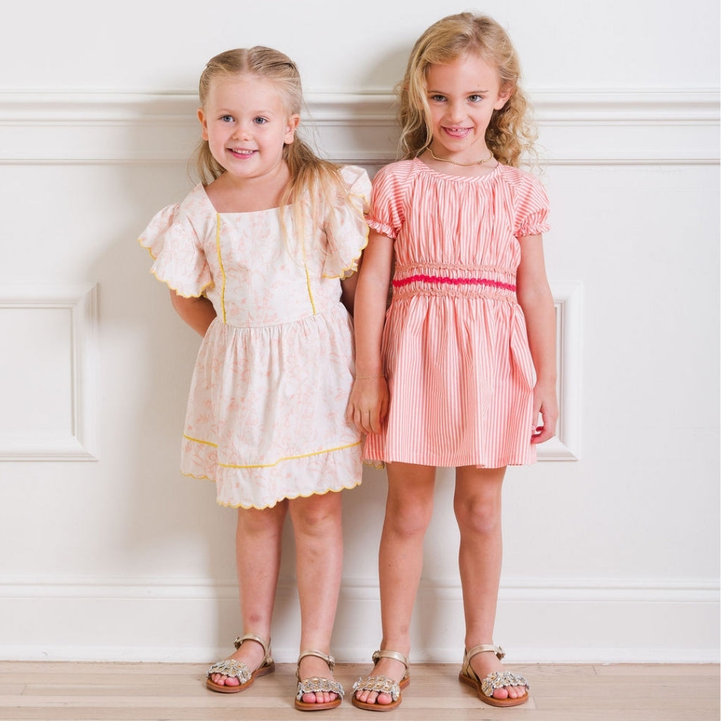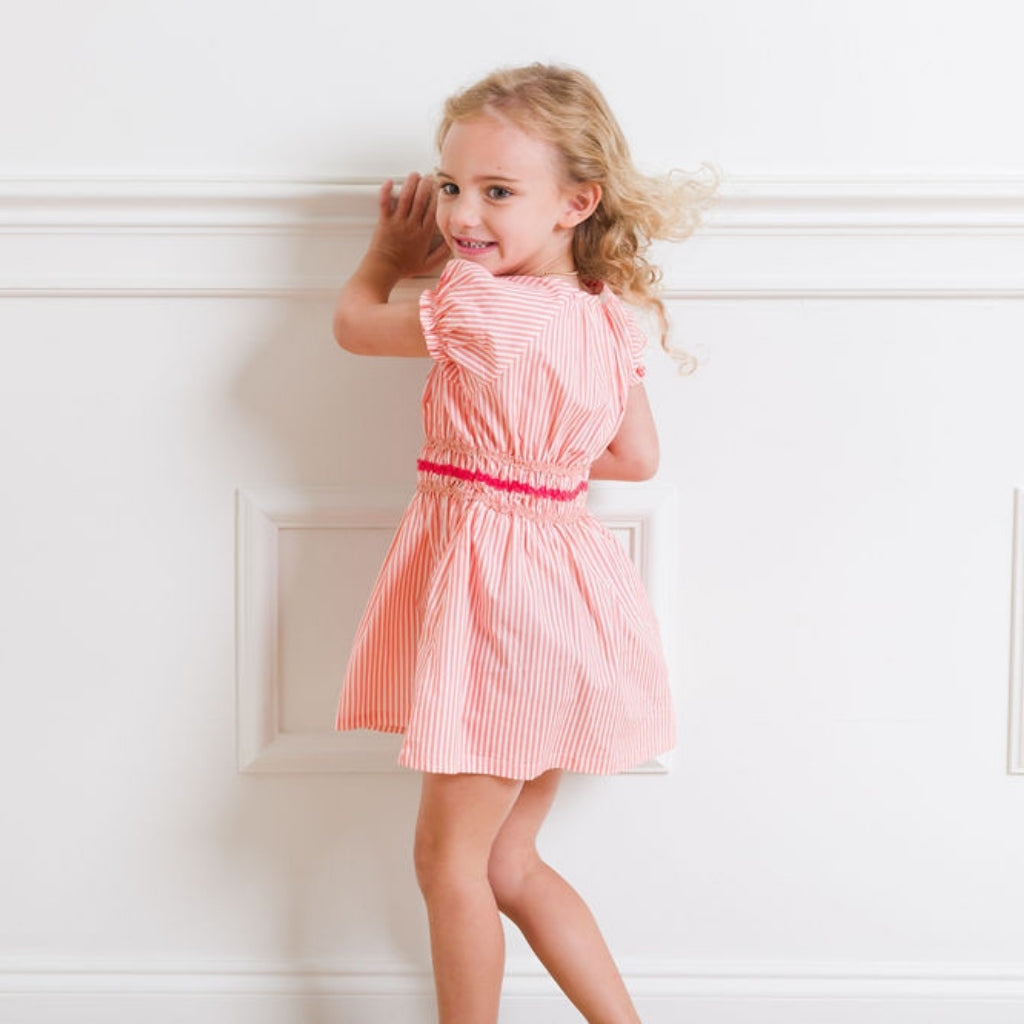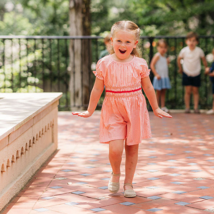 Meet the Marbella Dress – A playful pop of color meets effortless ease in the Marbella, a joyful cotton dress made for warm days and sunset strolls. With bold vertical stripes, fluttered sleeves, and a double band of ruched contrast smocking at the waist, this style brings a burst of Mediterranean sunshine to your little one's wardrobe. Named after the vibrant seaside town of Marbella on Spain’s southern coast, this dress channels the energy, color, and carefree rhythm of coastal life.