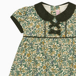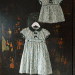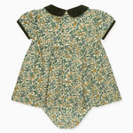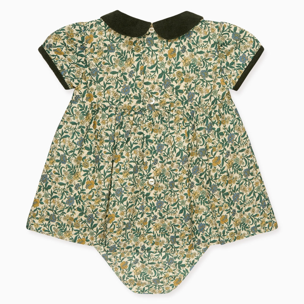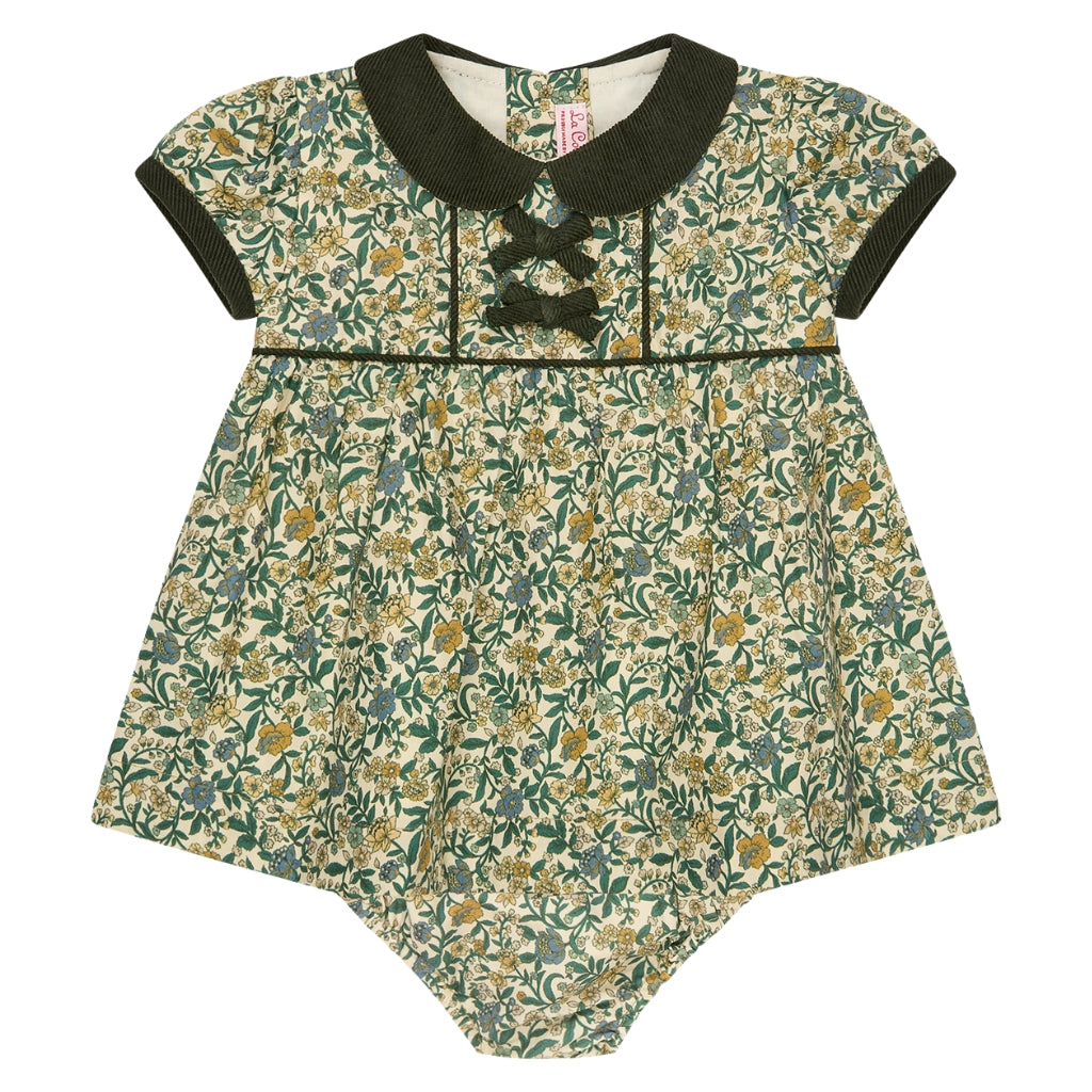 This dress & bloomer set is made of 100% cotton and runs true to size; we recommend purchasing the exact age for the perfect fit. If the child is in between ages we recommend purchasing the next age up for the perfect fit. From a sizing perspective, La Coqueta recommends babies wearing 3-6M in size to take the 6M, 6-12M in size to take the 12M, and 12-18M in size to take the 18M.