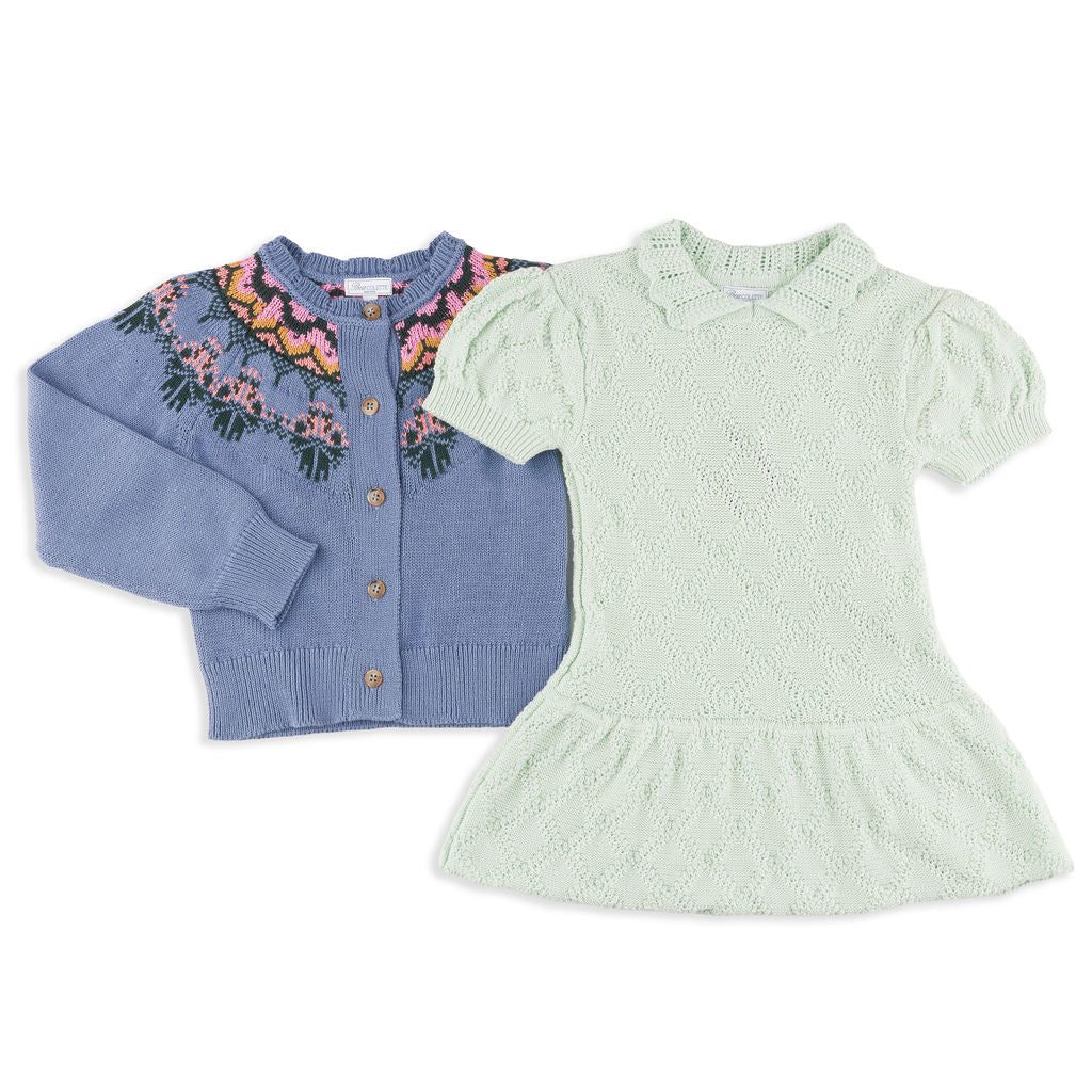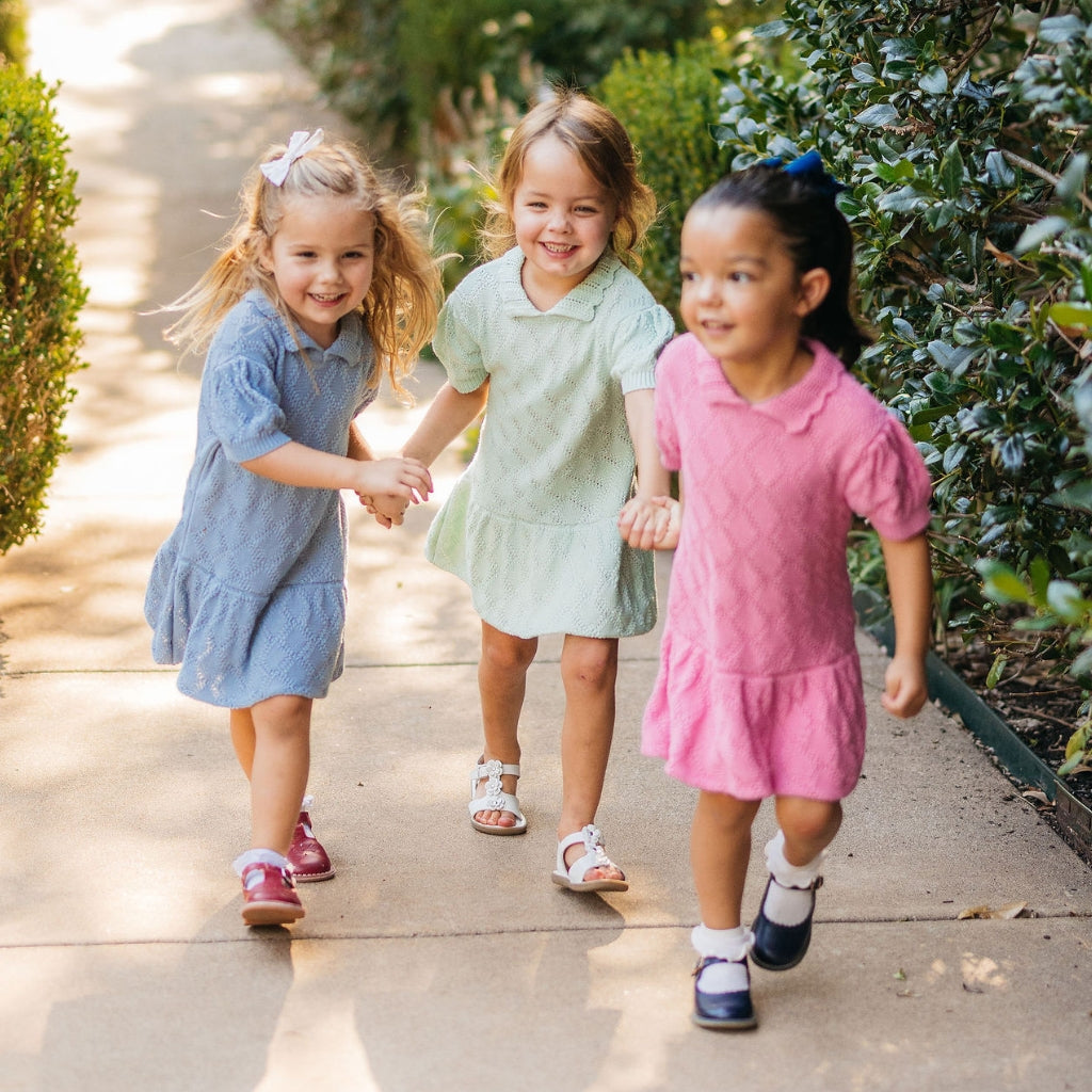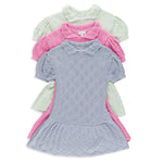 Fit & Design Details: The Primrose runs true to US sizing and even a bit long in length; you do not need to size up In this dress. The size 8-10 leans closer to a girls size 10. Available in azalea pink, mint and cornflower blue, the Primrose is suitable for year-round wear on girls 2 to 10 years. Delicate in design with its diamond pointelle knit, scalloped collar, and puff sleeves, this dress strikes the perfect balance of sweetness and sophistication, effortlessly pairing with everything from sandals to Mary Janes to ballet flats to sneakers. Each piece is handmade by artisans, so no two products will be exactly alike, adding to their unique charm.