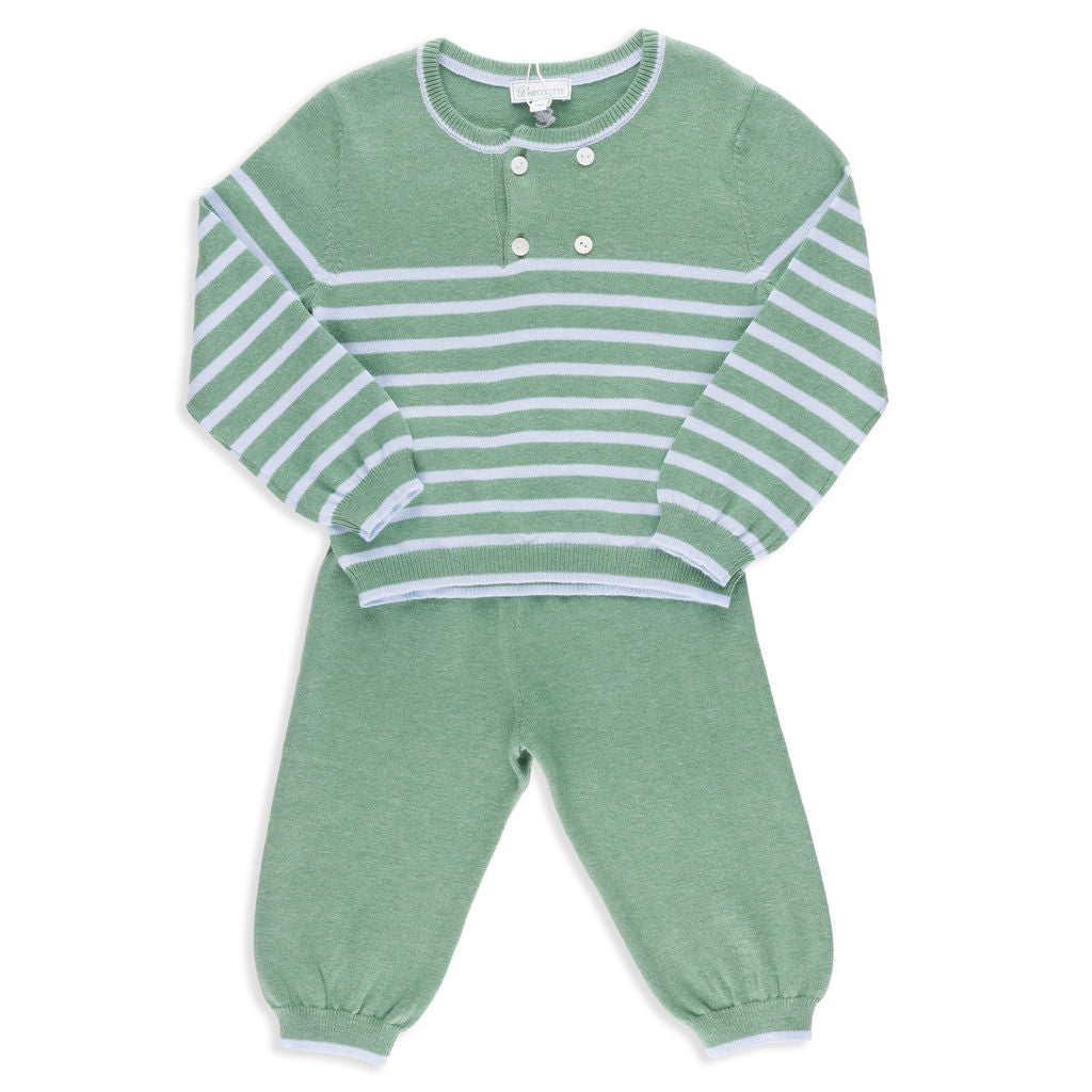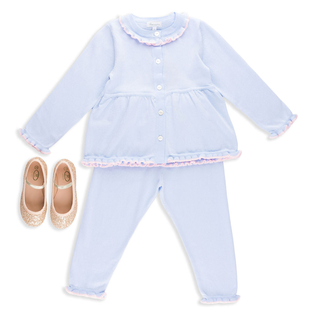 Meet the Valencia Set – a sleek, soft, and versatile two-piece knitwear set that embodies Italian craftsmanship and elevated design. Made in Tuscany from 100% premium cotton, it features feminine frilly piping on the pant, sleeve, and hem, offering a playful yet sophisticated look. Available in green/pink, pale pink/ivory, slate blue/ivory, emerald green/slate blue, hibiscus pink/scarlet, ivory with sky blue trim, and this gorgeous celestial blue with pink trim. it suits girls aged 12 months to 8 years and is perfect for year-round wear. True to US sizing (the fit is intentionally a little oversized in the tunic-style cardigan).