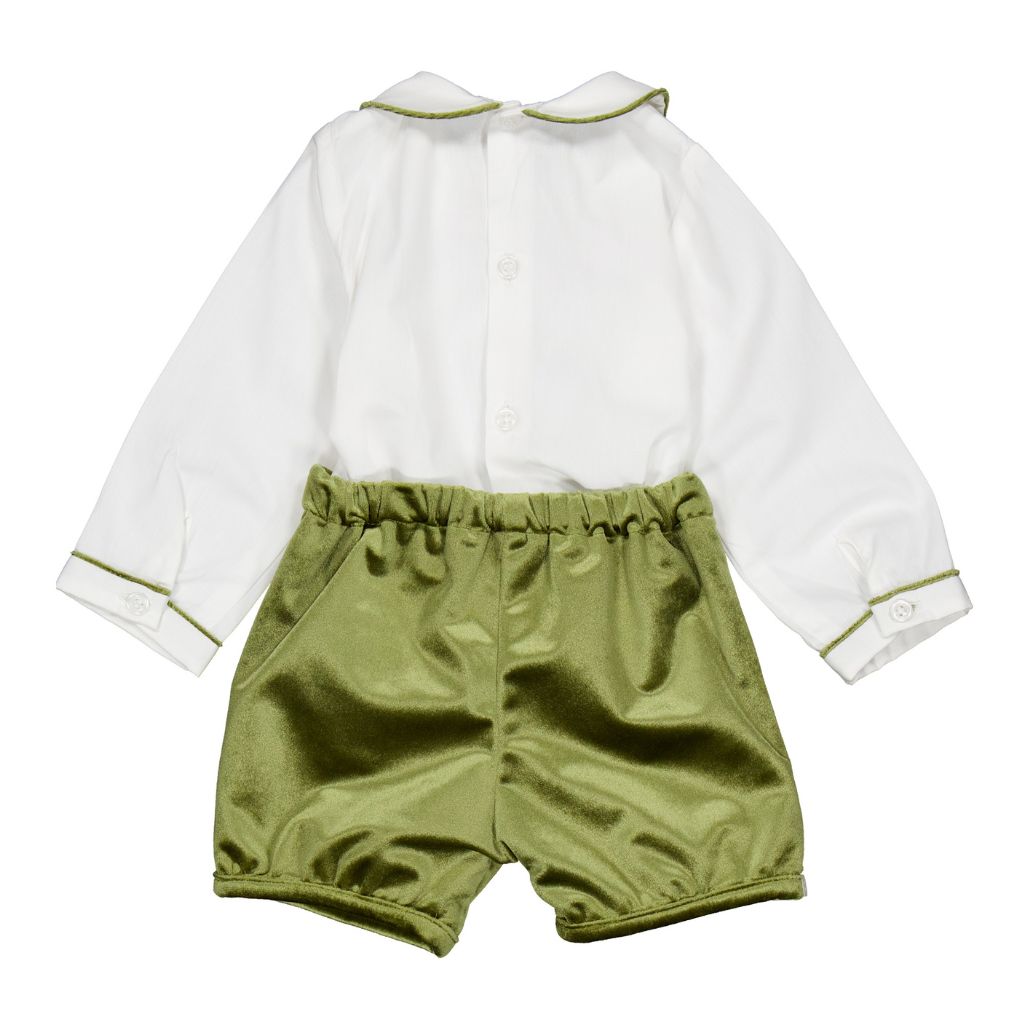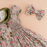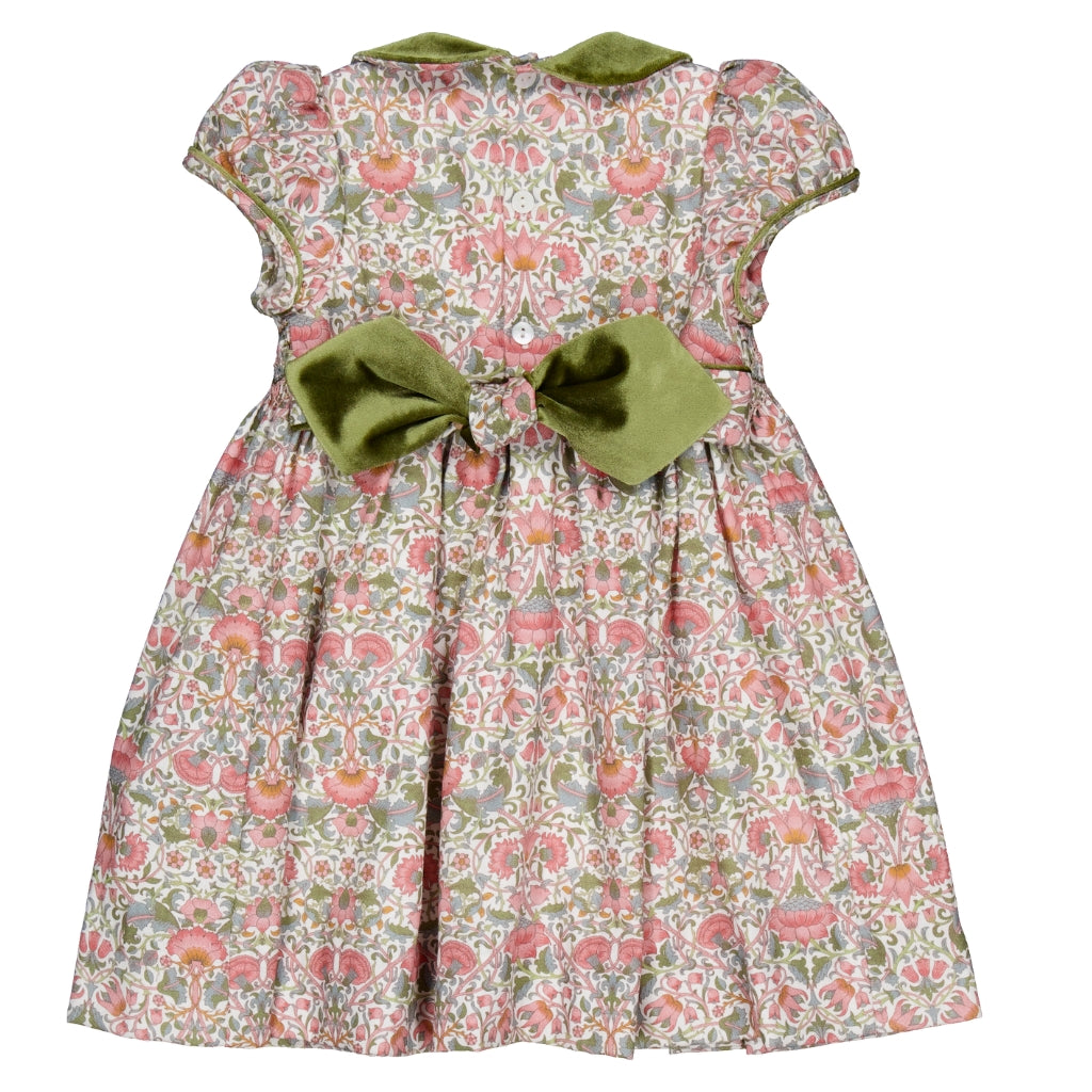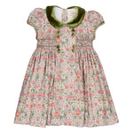 Rison Smocked Dress in Pink Baroque Flower Print with Olive Velvet Collar