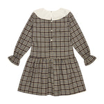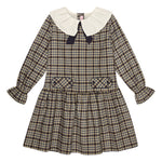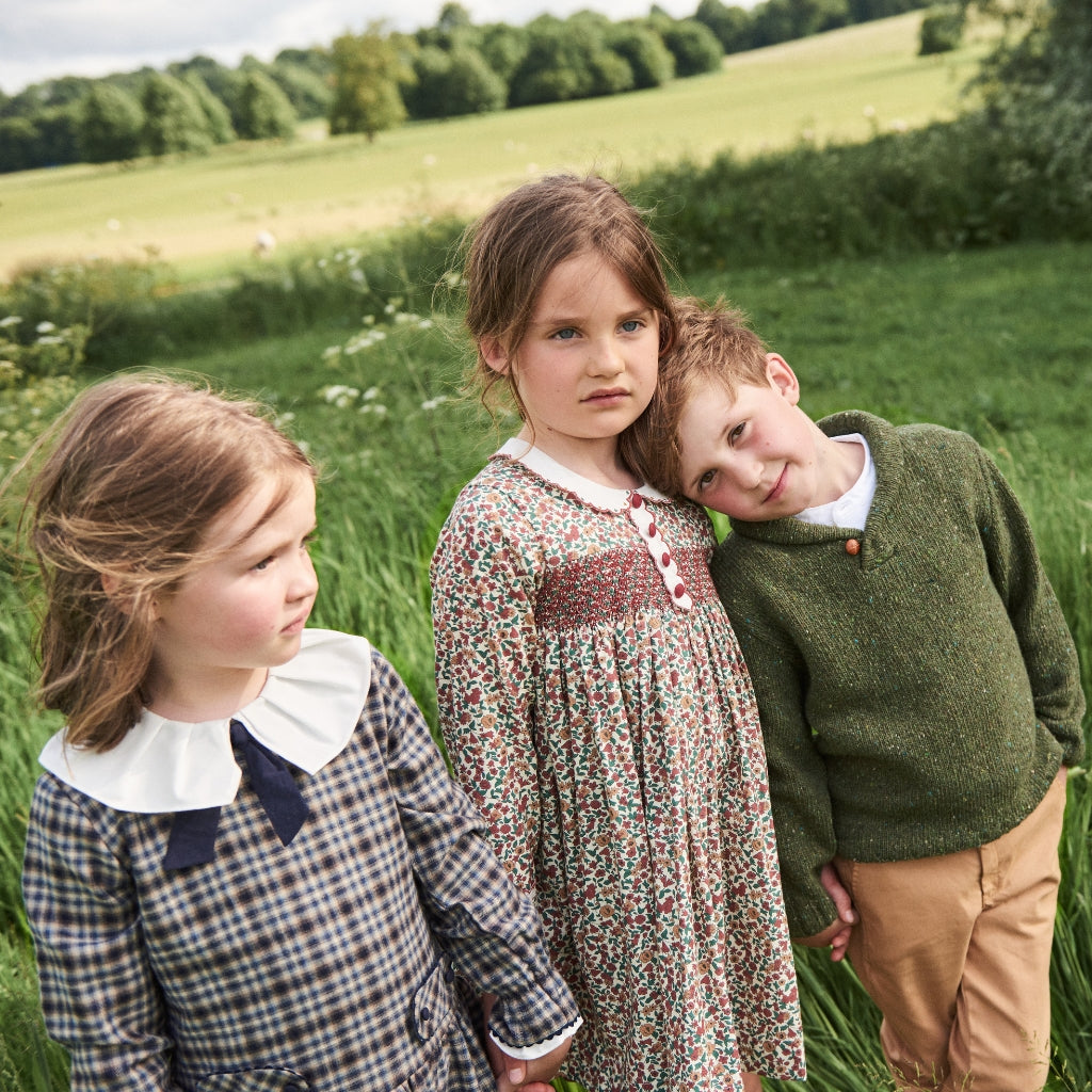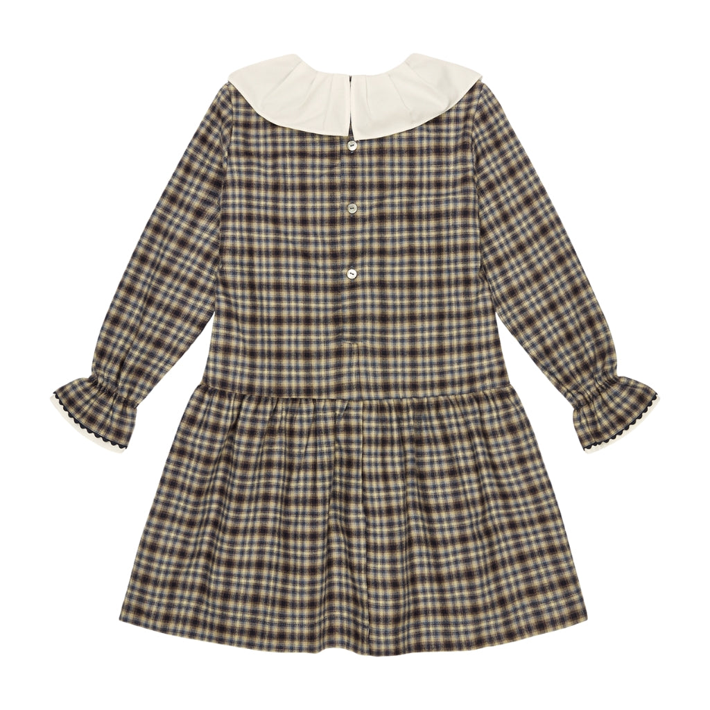 The Tessa Drop Waist Dress is a timeless style for the season, designed in a soft cotton-wool blend with a navy and brown check pattern. Featuring a classic fit-and-flare shape, it’s finished with long blouson sleeves edged in ivory cotton and navy ric rac, a delicate frill collar, and a loose navy bow at the neckline. The skirt falls into an easy, floaty drop waist that moves beautifully, while a pure cotton lining ensures comfort. A row of mother-of-pearl buttons fastens at the back for an elegant touch. Perfect for both special occasions and everyday wear, it pairs seamlessly with coordinating pieces like the Mateo Long Sleeve Boy Shirt, and the Sierra Baby Romper.