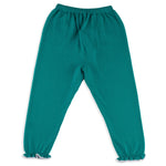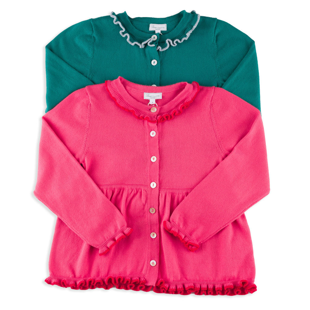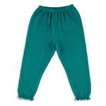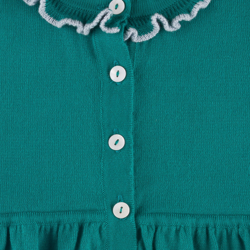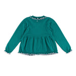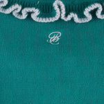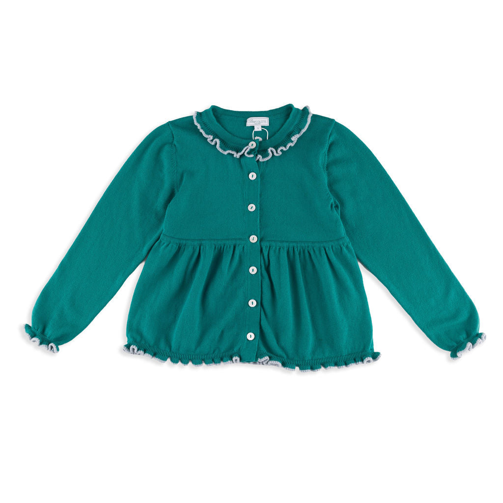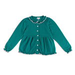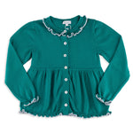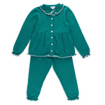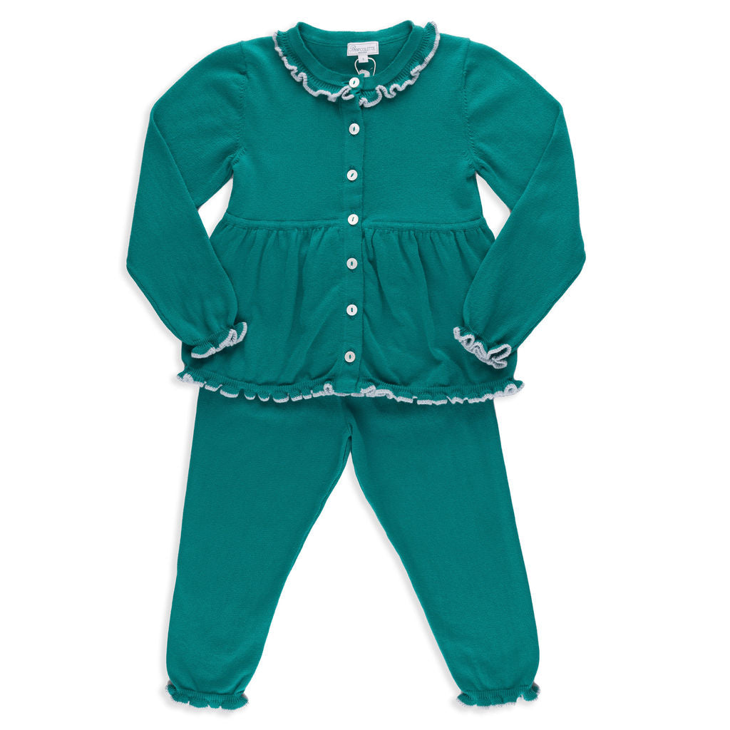 Valencia Cardigan + Pant Set in Emerald Green with Slate Blue Frill Trim