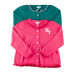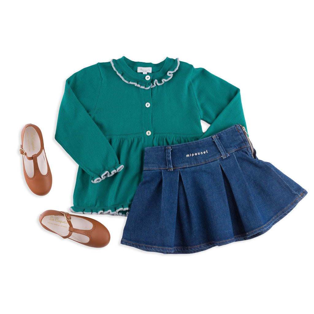 Meet the Valencia Set – a sleek, soft, and versatile two-piece knitwear set that embodies Italian craftsmanship and elevated design. Made in Tuscany from 100% premium cotton, it features feminine frilly piping on the pant, sleeve, and hem, offering a playful yet sophisticated look. Available in green/pink, pale pink/ivory, slate blue/ivory, hibiscus pink/scarlet, and of course this gorgeous emerald green/slate blue, it suits girls aged 12 months to 8 years and is perfect for year-round wear. True to US sizing (the fit is intentionally a little oversized in the tunic-style cardigan).