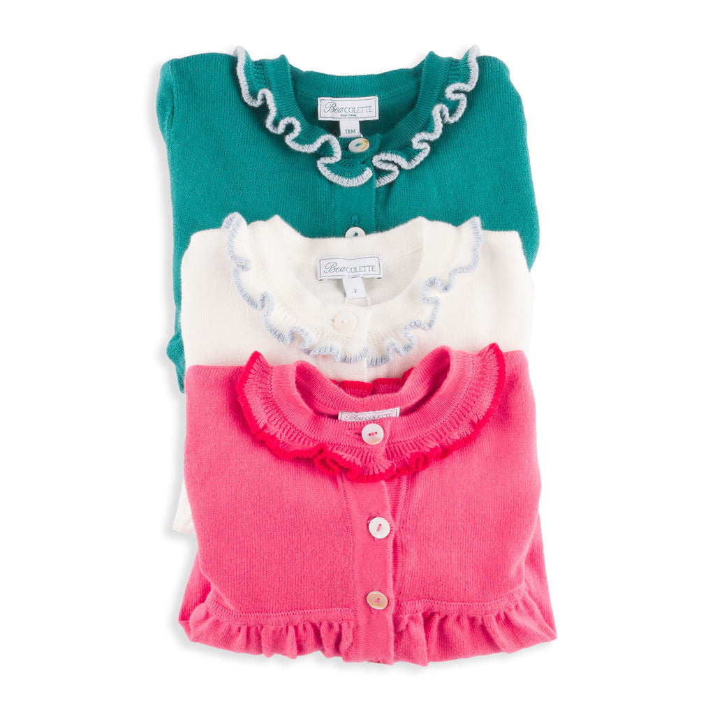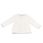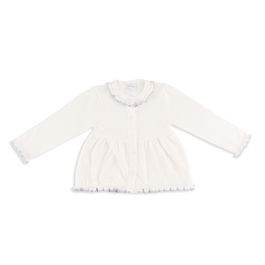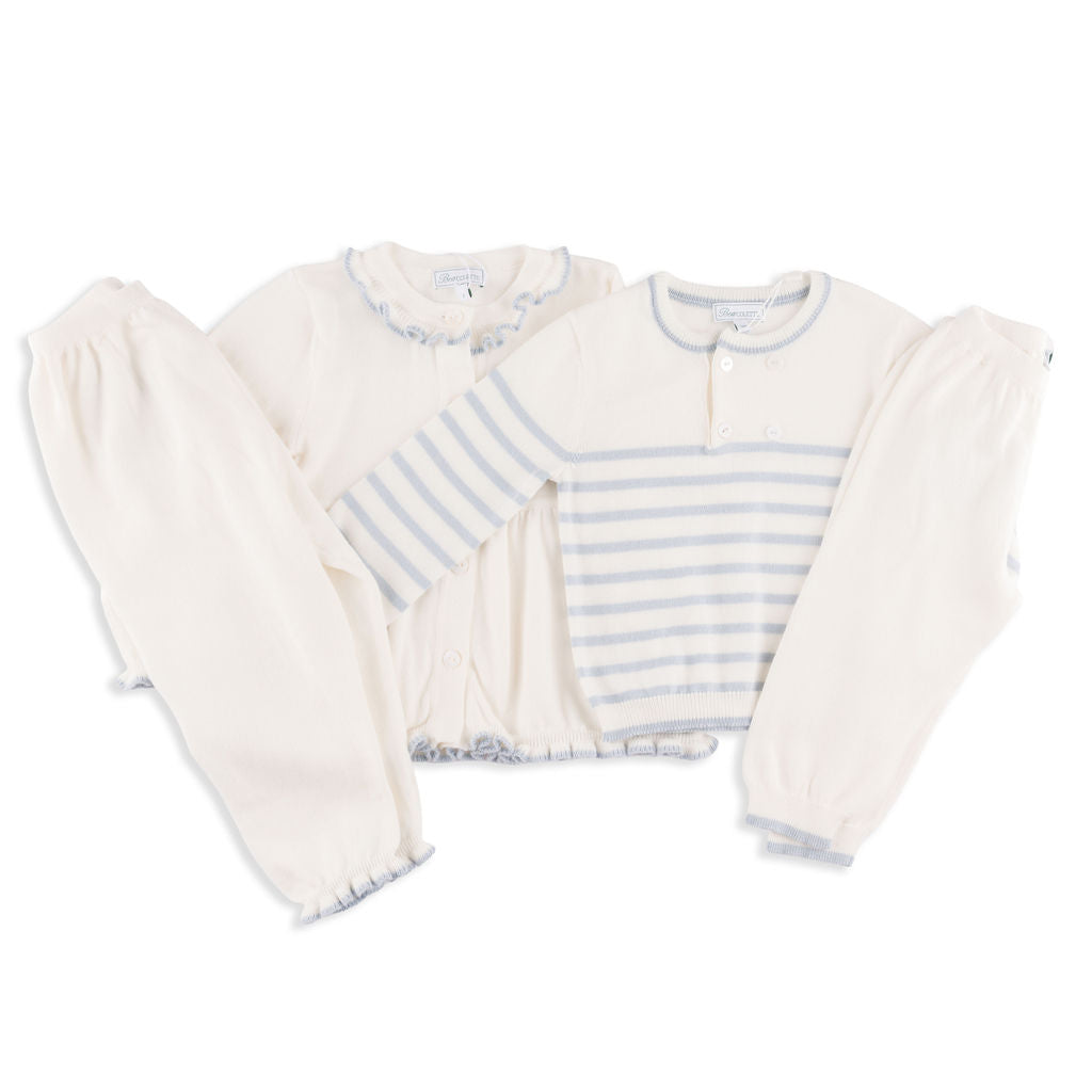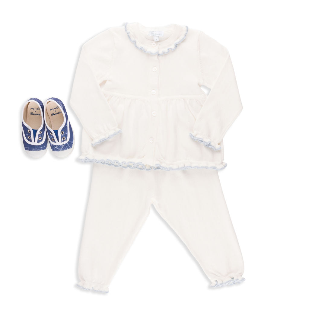 Meet the Valencia Set – a sleek, soft, and versatile two-piece knitwear set that embodies Italian craftsmanship and elevated design. Made in Tuscany from 100% premium cotton, it features feminine frilly piping on the pant, sleeve, and hem, offering a playful yet sophisticated look. Available in green/pink, pale pink/ivory, slate blue/ivory, emerald green/slate blue, hibiscus pink/scarlet, and this gorgeous ivory with sky blue trim, it suits girls aged 12 months to 8 years and is perfect for year-round wear. True to US sizing (the fit is intentionally a little oversized in the tunic-style cardigan).