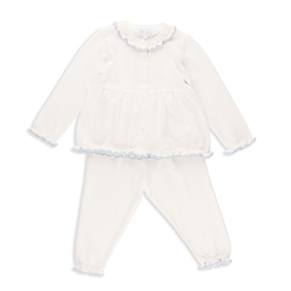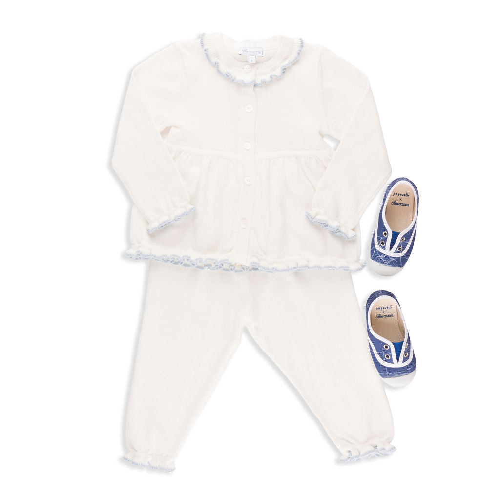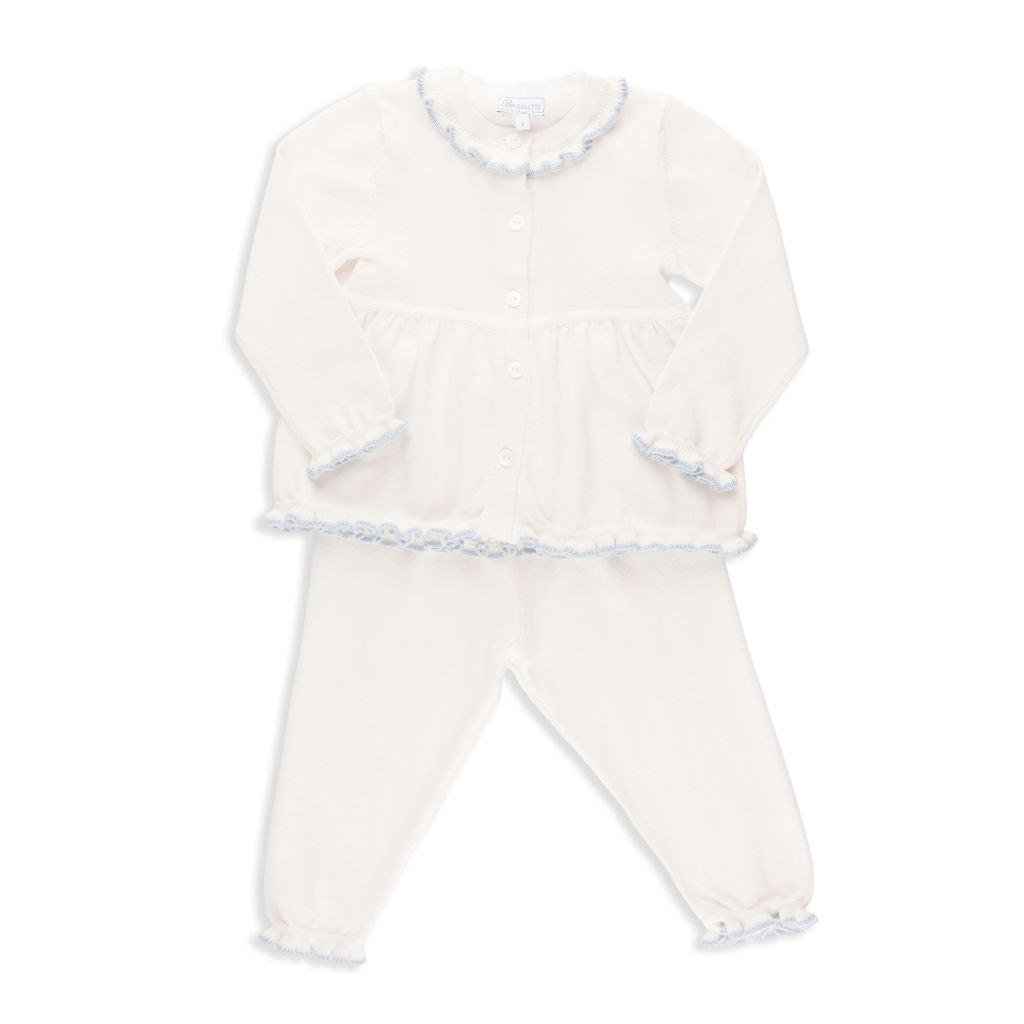 Valencia Cardigan + Pant Set in Ivory with Slate Blue Trim