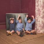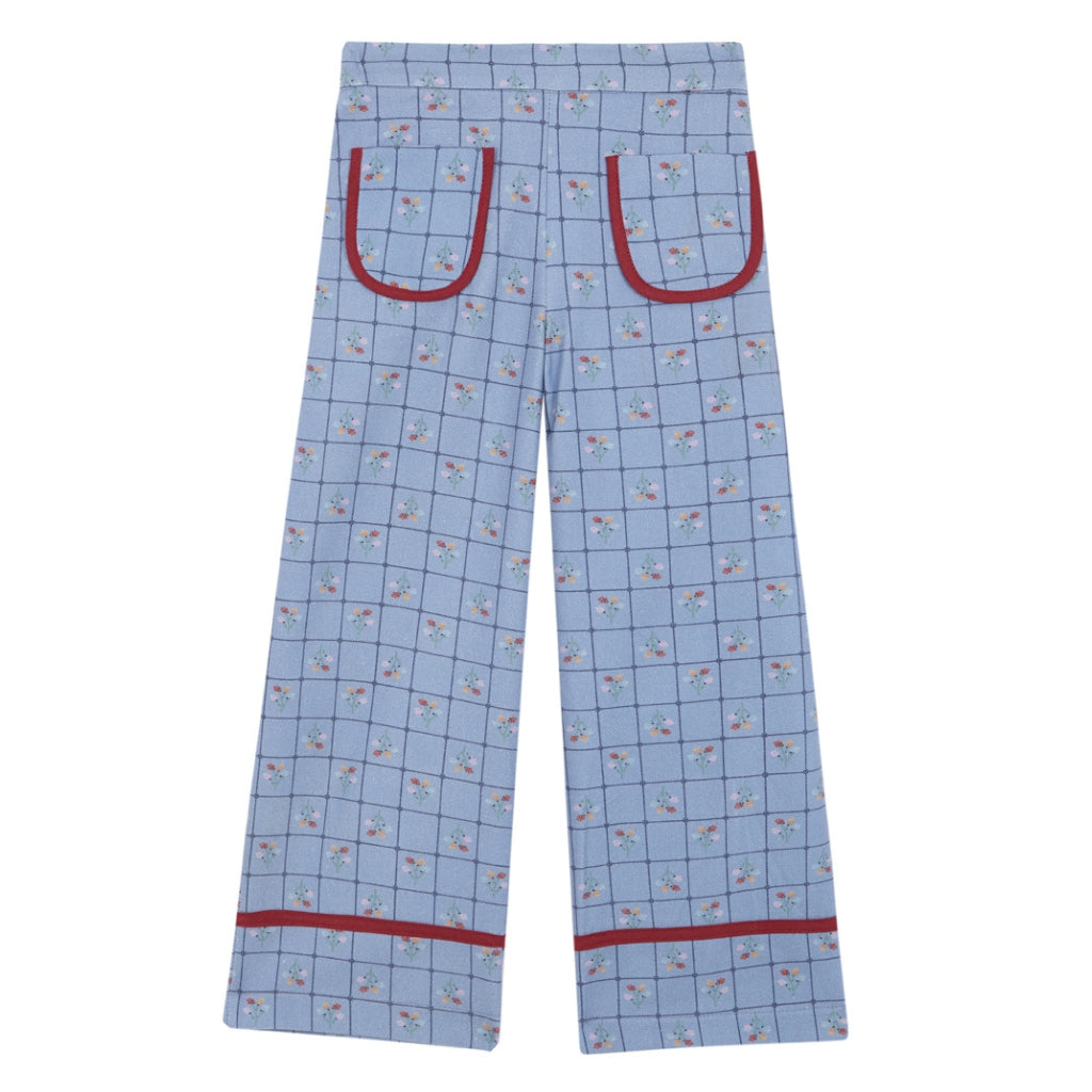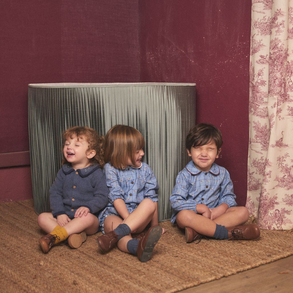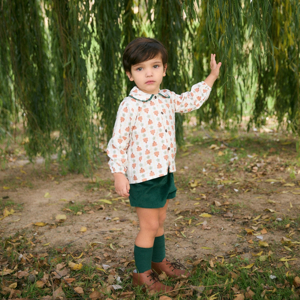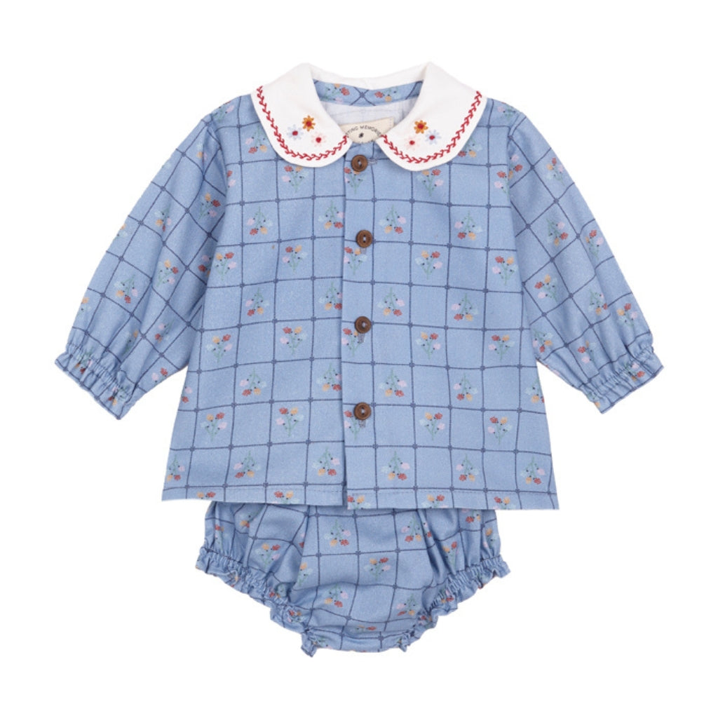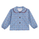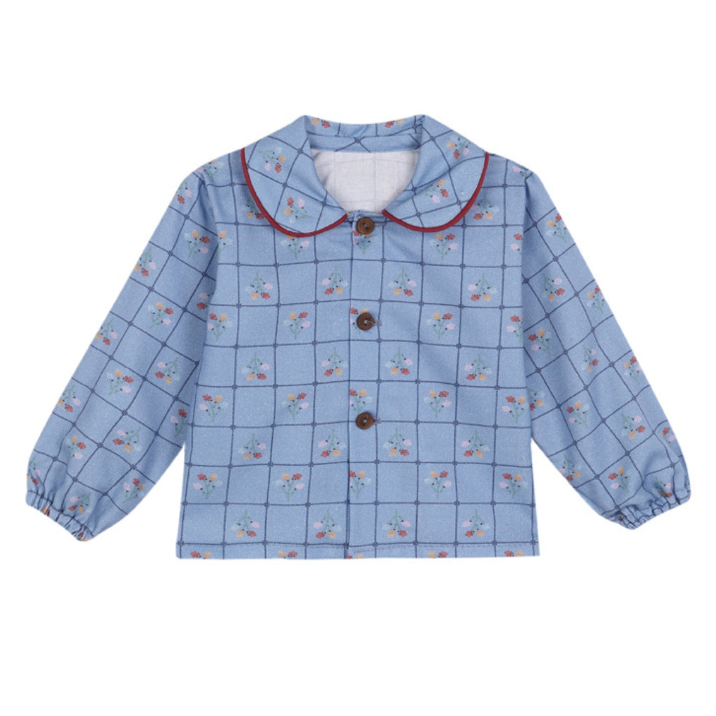 This charming baby blouse features a blue checkered pattern adorned with delicate floral prints, finished with a sweet Peter Pan collar trimmed in burgundy piping. Made from soft, breathable fabric, it’s perfect for adding a vintage touch to your little one’s everyday wardrobe.