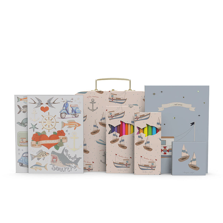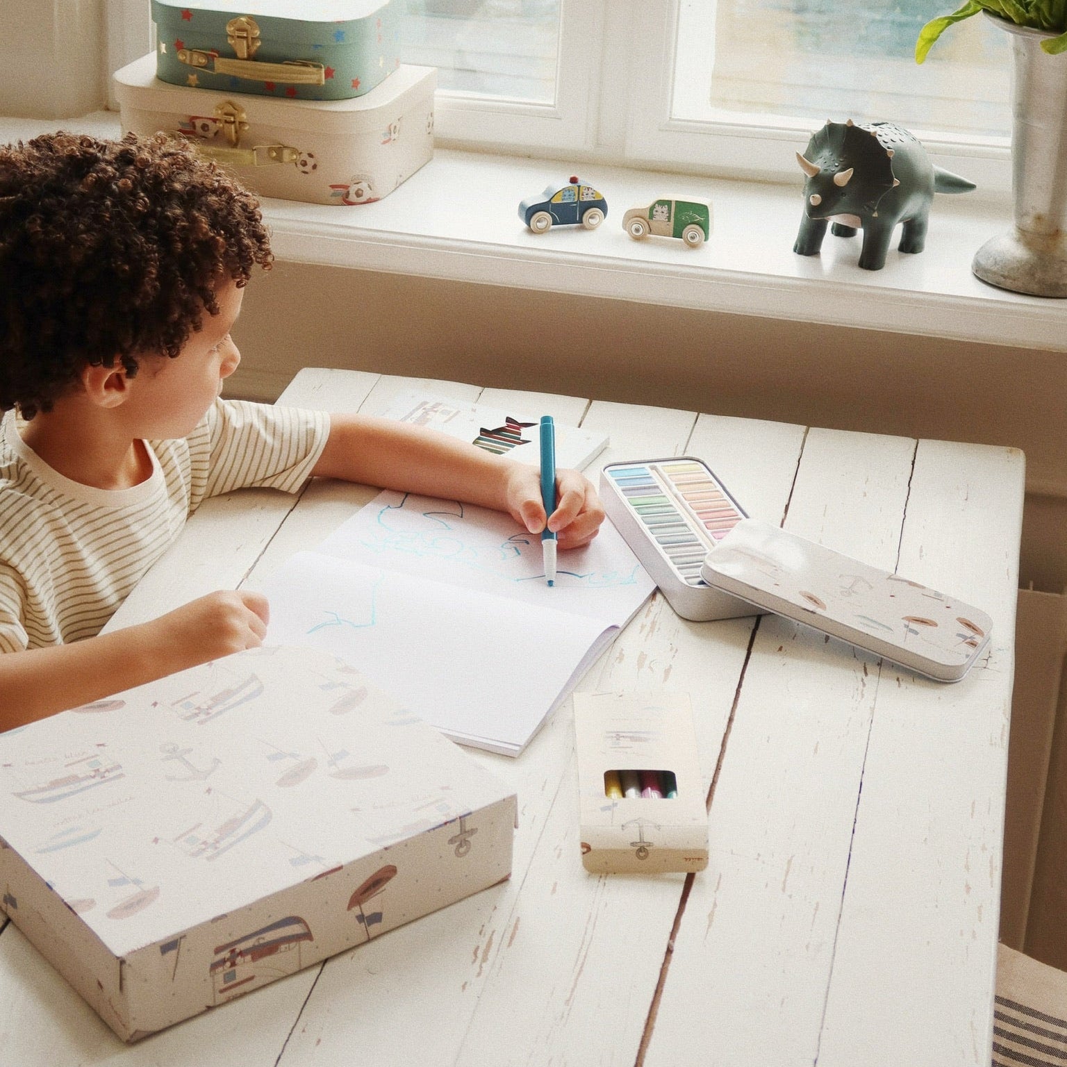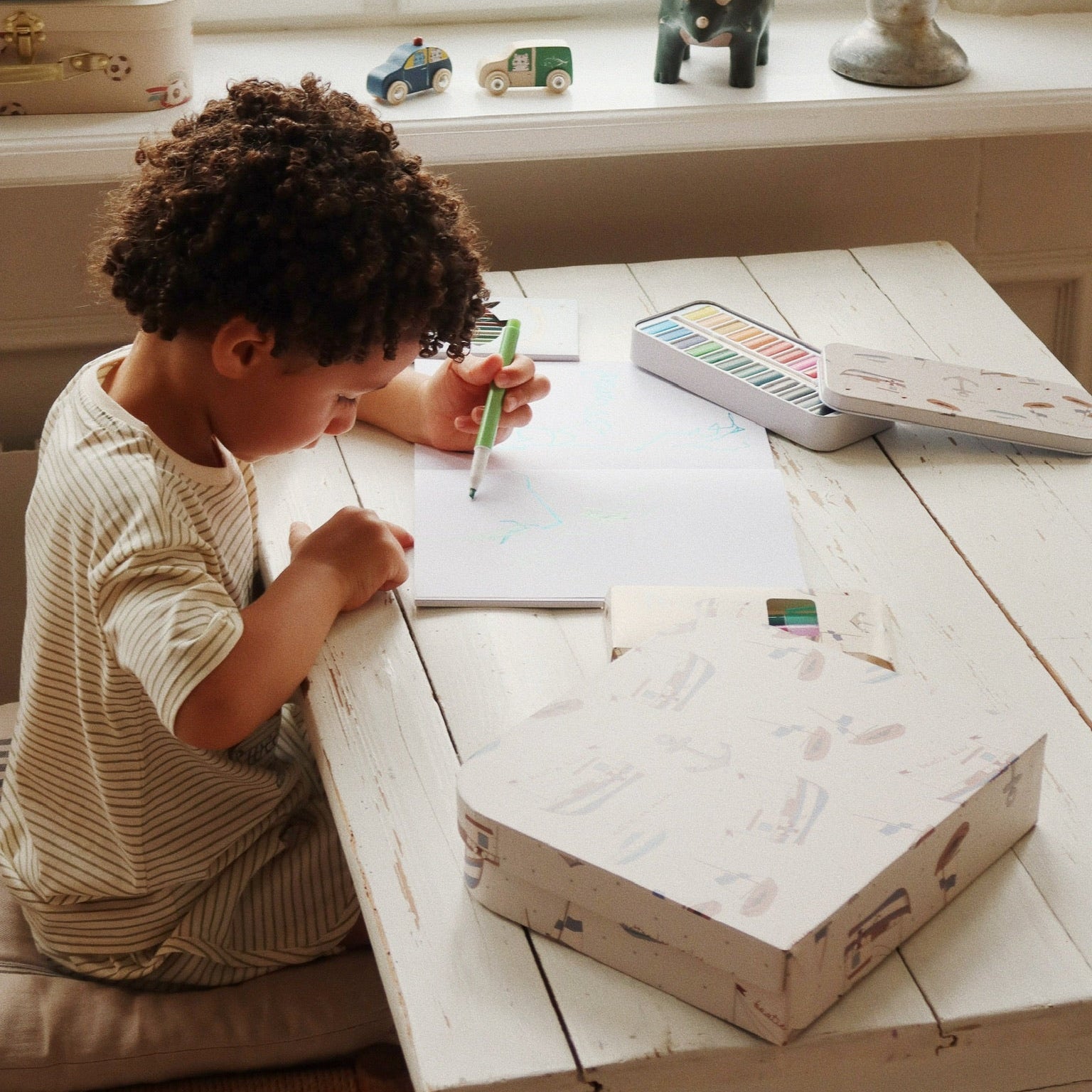A suit case with all you need to explore as a creative little artist. Perfect as a gift or for bringing along on your holidays. Contains: 12 pcs coloring pencils in box 6 pcs markers in box 6 pcs oil pastels in box 2 sheets of stickers 1 note pad This product is A-labelled, controlled by FFFH 3y+ CE-certified