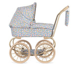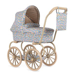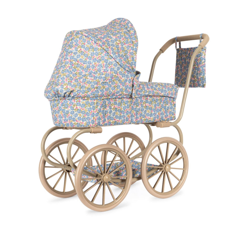 Our vintage style doll pram in a smaller version that is easy for little doll parents to maneuver. Designed with four large wheels that make it easy and stable to walk with, quilted fabric, and delicate scallop edges. The doll pram includes a foldable sun canopy and a cushioned storage basket under the lift. The frame is made of metal with spongy soft handles. Comes fully assembled and is easy to fold and store. Measurements: H: 72 cm x W: 31 cm x L: 55 cm Suitable from 3y+ WARNING! CHOKING HAZARD. Small parts. Not suitable for children under 36 months CE-certified