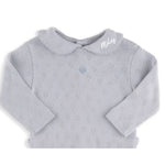 This charming sea blue baby overall features a subtle heart-knit pattern and an elegant scalloped Peter Pan collar. Accented with a matching embroidered heart at the chest, it's a cozy and stylish essential for your little one's wardrobe.