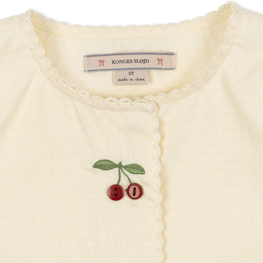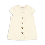 The Evia Cherry Dress in White showcases a crisp, fresh backdrop adorned with playful cherry motifs for a sweet, summery charm. Its light, breezy silhouette makes it perfect for warm days, from picnics to family outings.