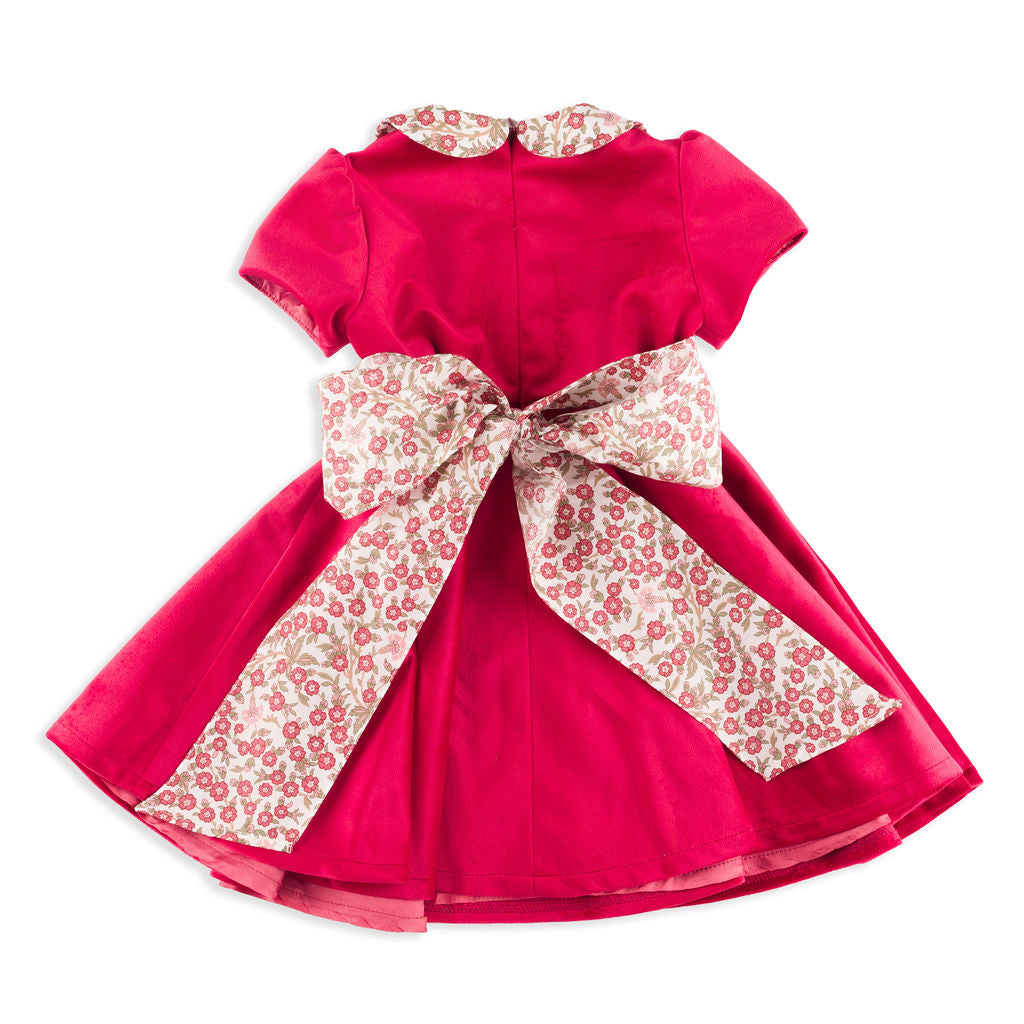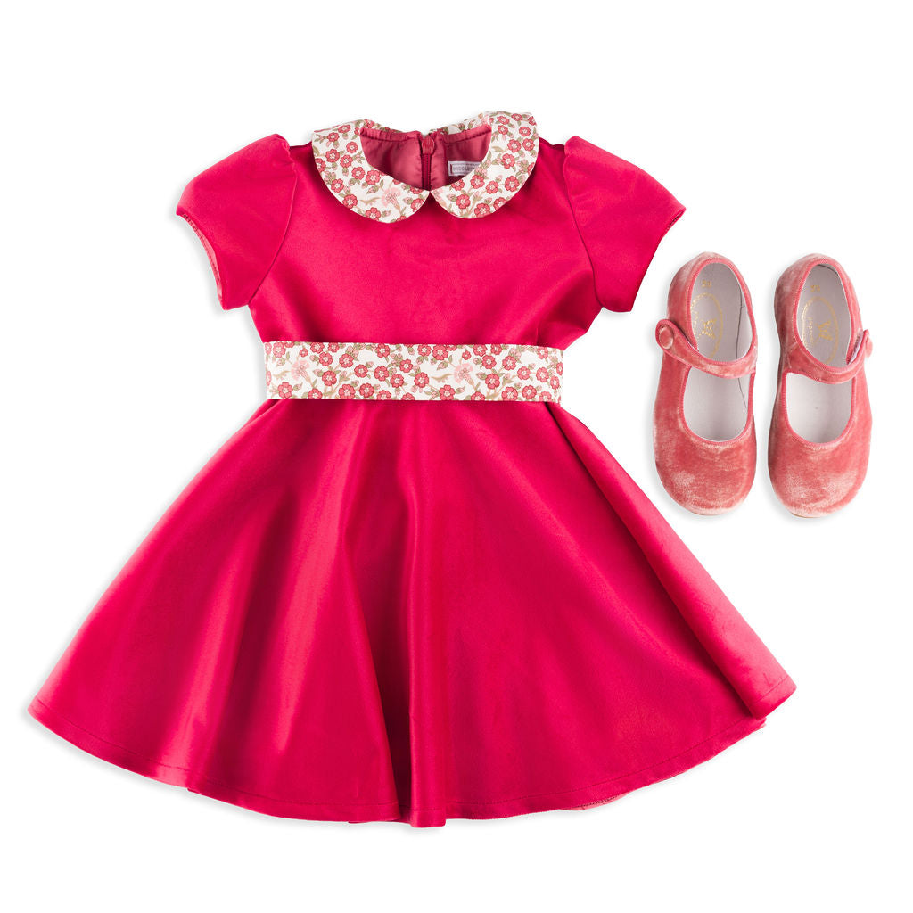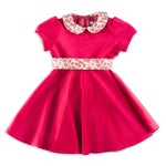 The Molly Velvet Dress showcases a rich, darker red hue paired with a charming floral collar for a touch of vintage elegance. Crafted from smooth velvet, this dress offers a luxurious feel perfect for festive occasions or special outings.