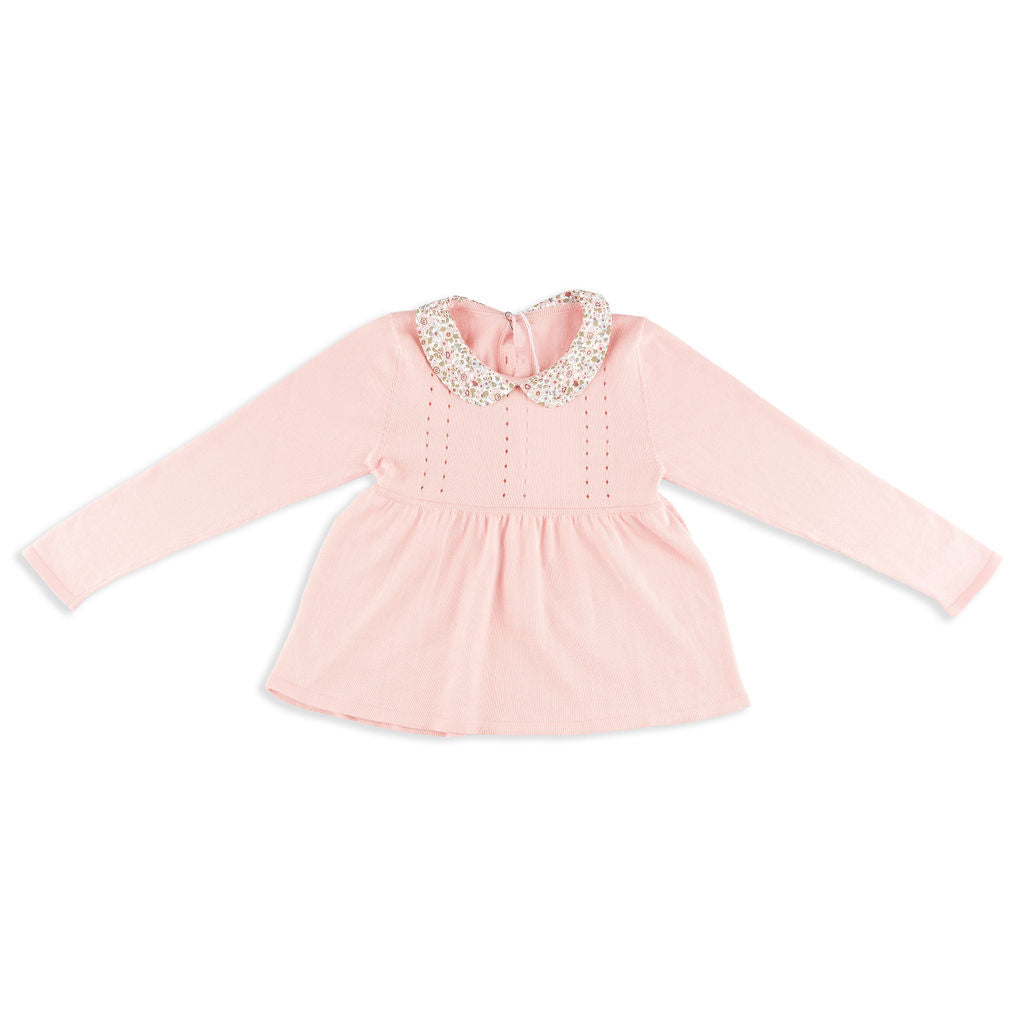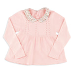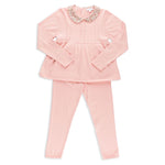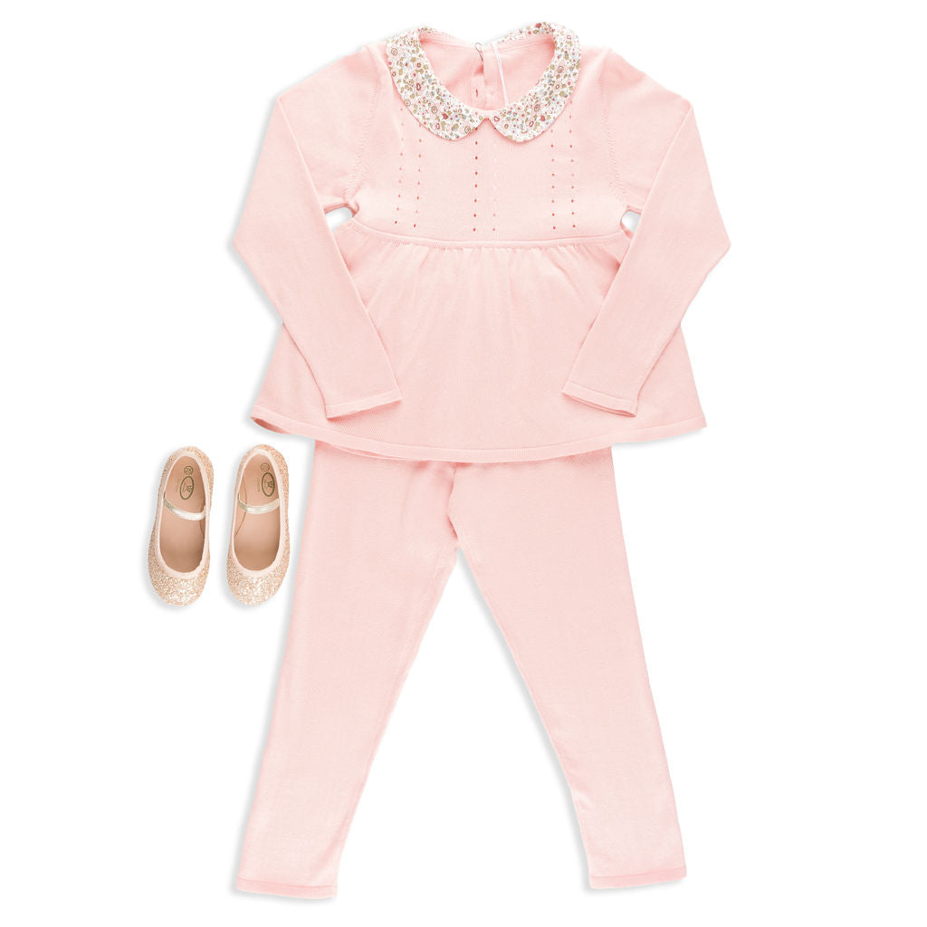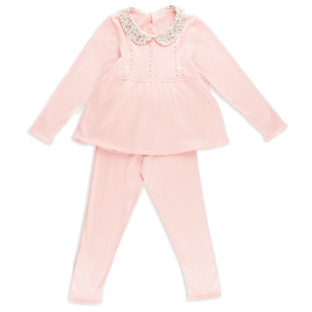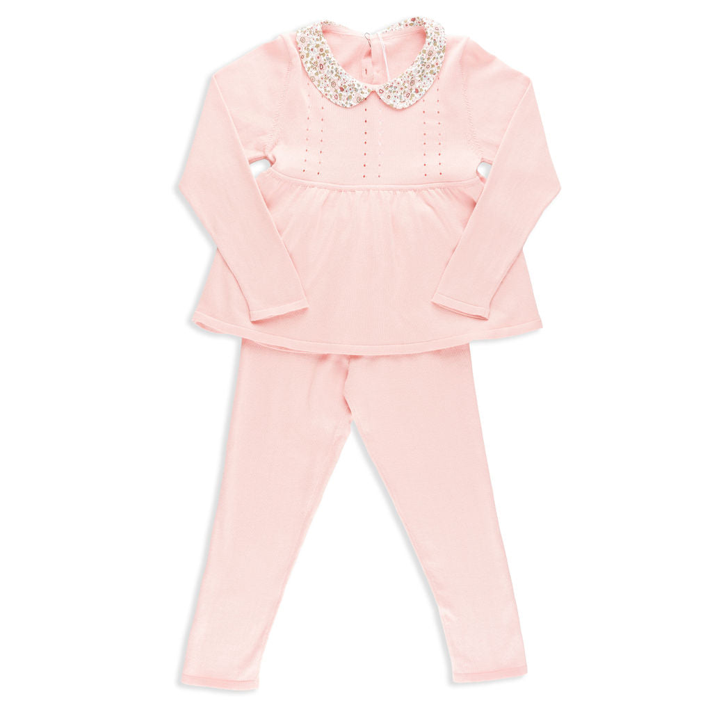 Meet the Belmonte Set: Sweet, soft, and thoughtfully designed, this two-piece knit set is crafted for all-day comfort with an elevated, timeless feel. The long-sleeve top features delicate pointelle detailing and a gently flared silhouette, finished with a charming floral Peter Pan collar for a polished touch. Paired with matching slim-fit pants, the Belmonte is an instant outfit—easy for everyday play yet refined enough for special moments. Available in soft pink and butter yellow, it brings warmth, softness, and classic European-inspired charm to your little one’s wardrobe.