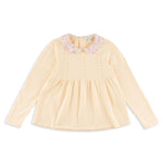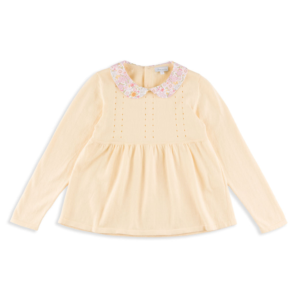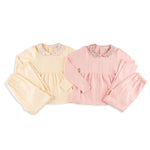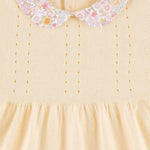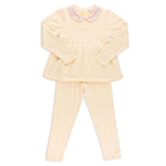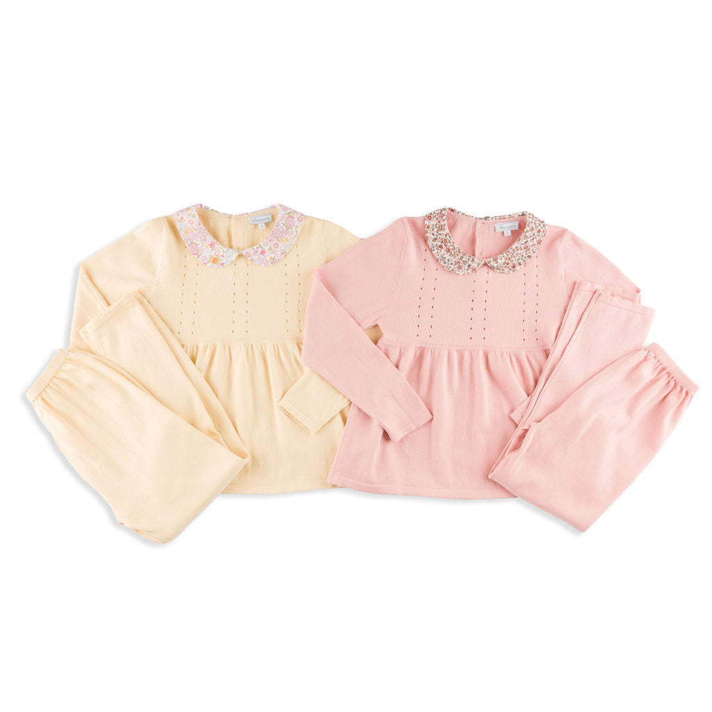 Meet the Belmonte Set: Sweet, soft, and thoughtfully designed, this two-piece knit set is crafted for all-day comfort with an elevated, timeless feel. The long-sleeve top features delicate pointelle detailing and a gently flared silhouette, finished with a charming floral Peter Pan collar for a polished touch. Paired with matching slim-fit pants, the Belmonte is an instant outfit—easy for everyday play yet refined enough for special moments. Available in soft pink and butter yellow, it brings warmth, softness, and classic European-inspired charm to your little one’s wardrobe.