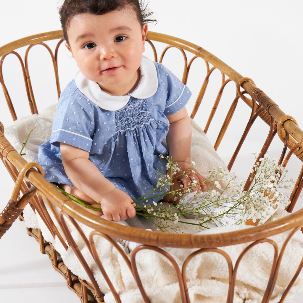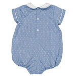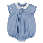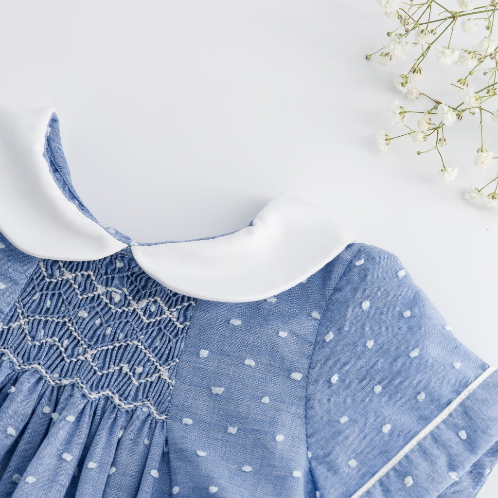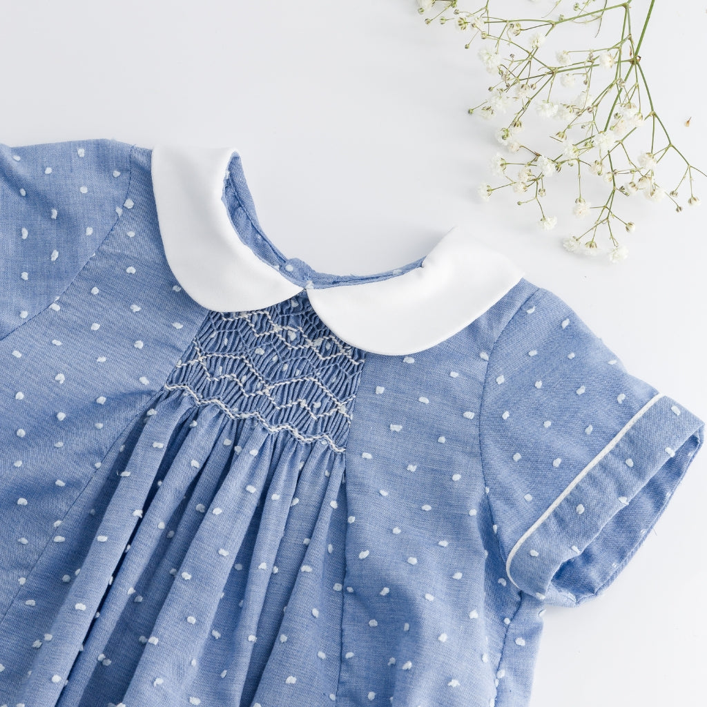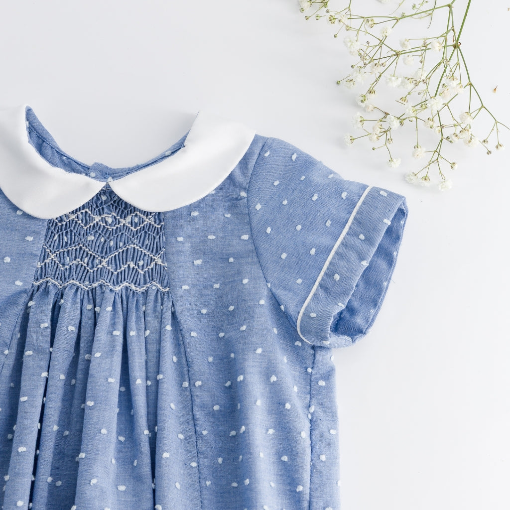 This style runs true to size. This classic blue romper features a subtle dotted texture with delicate hand-smocking at the chest and a crisp white Peter Pan collar for a timeless look. Finished with short sleeves, gentle gathers, and snap closures at the bottom, it offers both comfort and refined charm for everyday wear or special occasions.