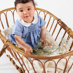 Caleb Smocked Boy Romper in Two-Tone Porcelain Blue Plumetis