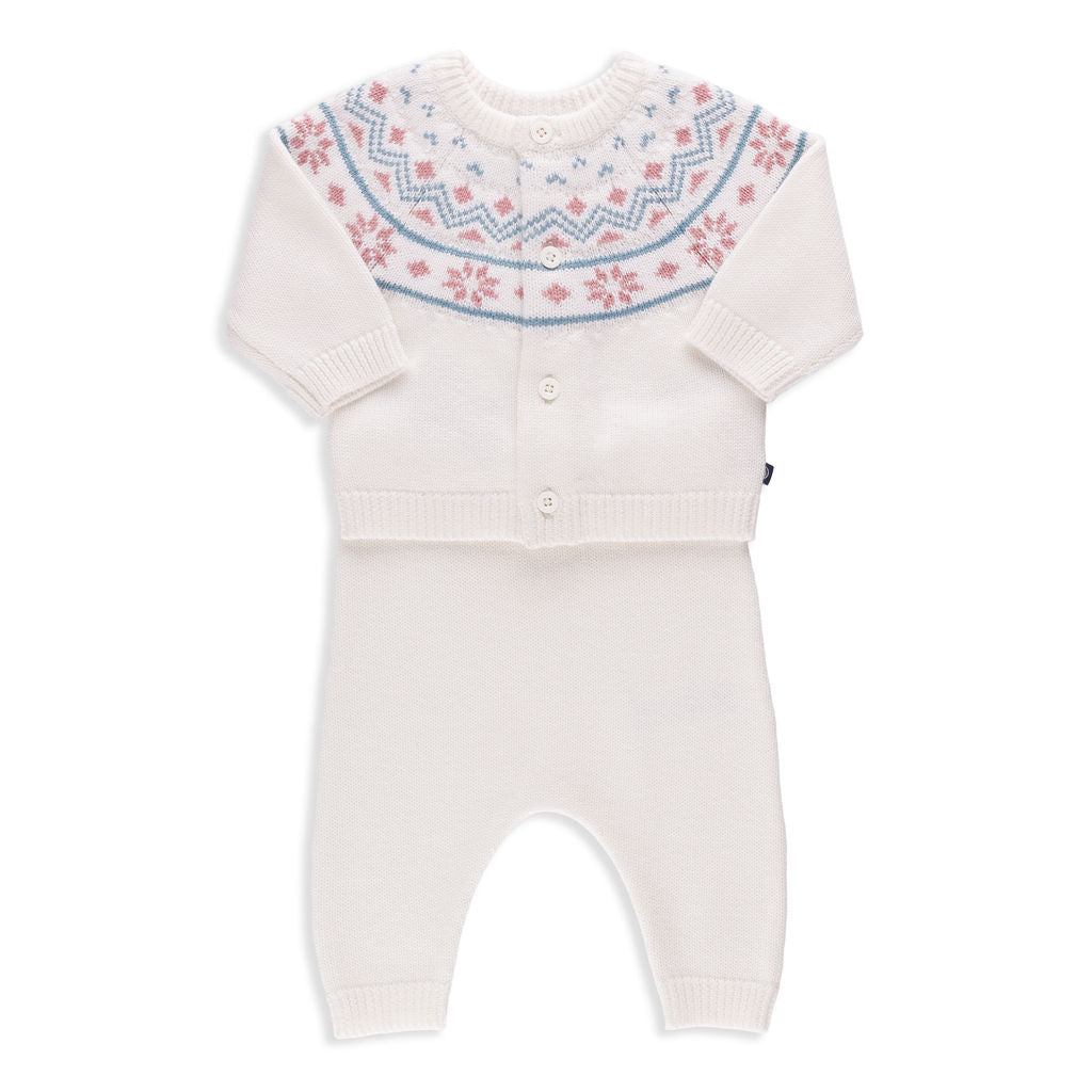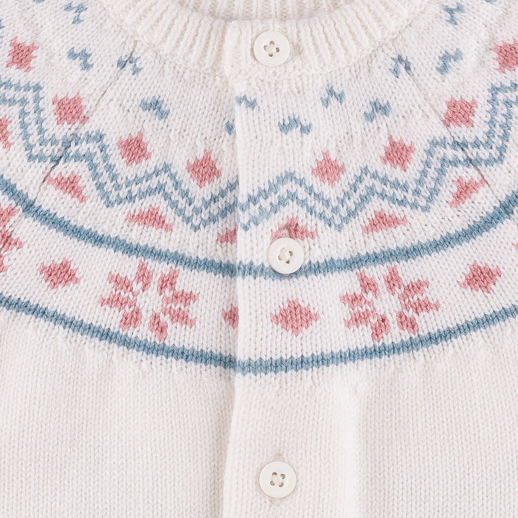 This cozy Boy Fairisle Sweater features a festive geometric pattern in green, beige, and red, paired with a buttoned high collar for added warmth. Perfect for chilly days, it combines comfort and style in a timeless winter design.