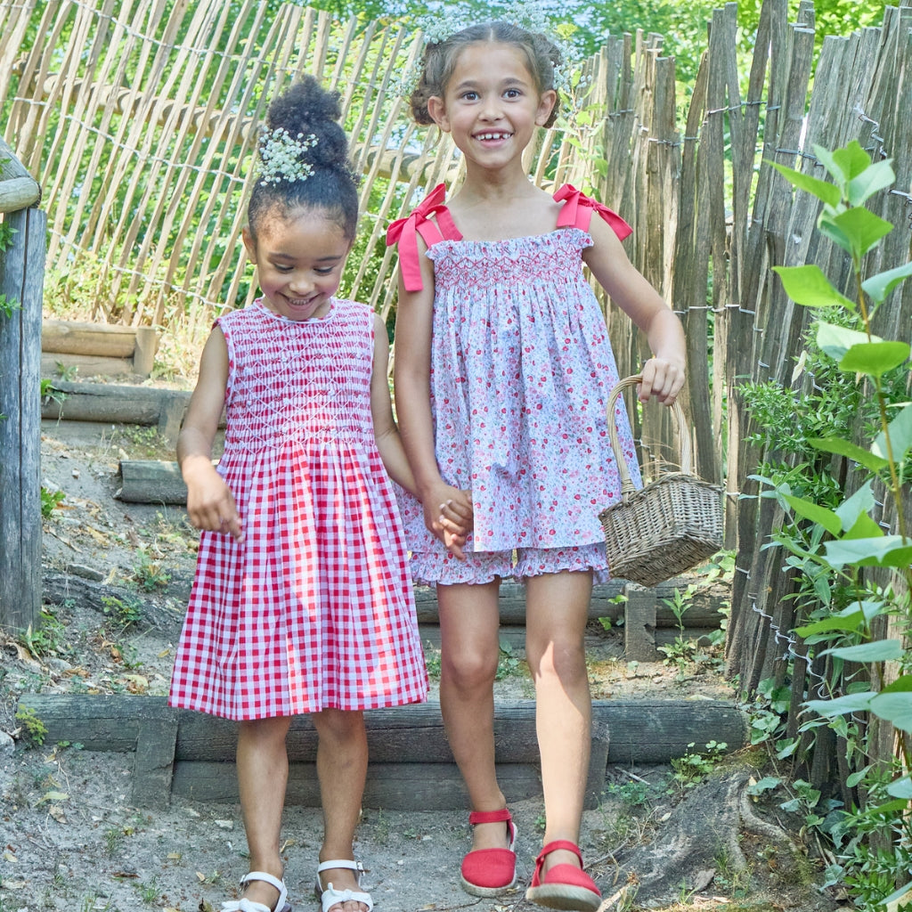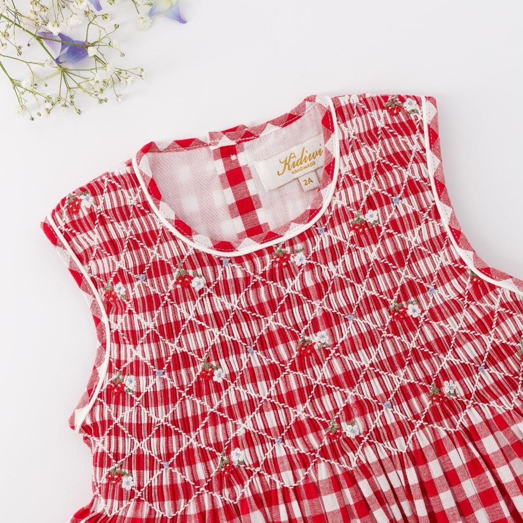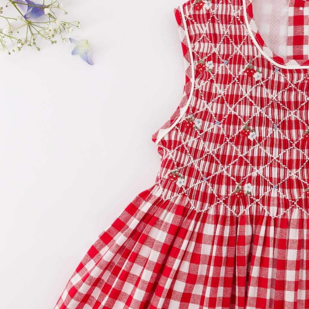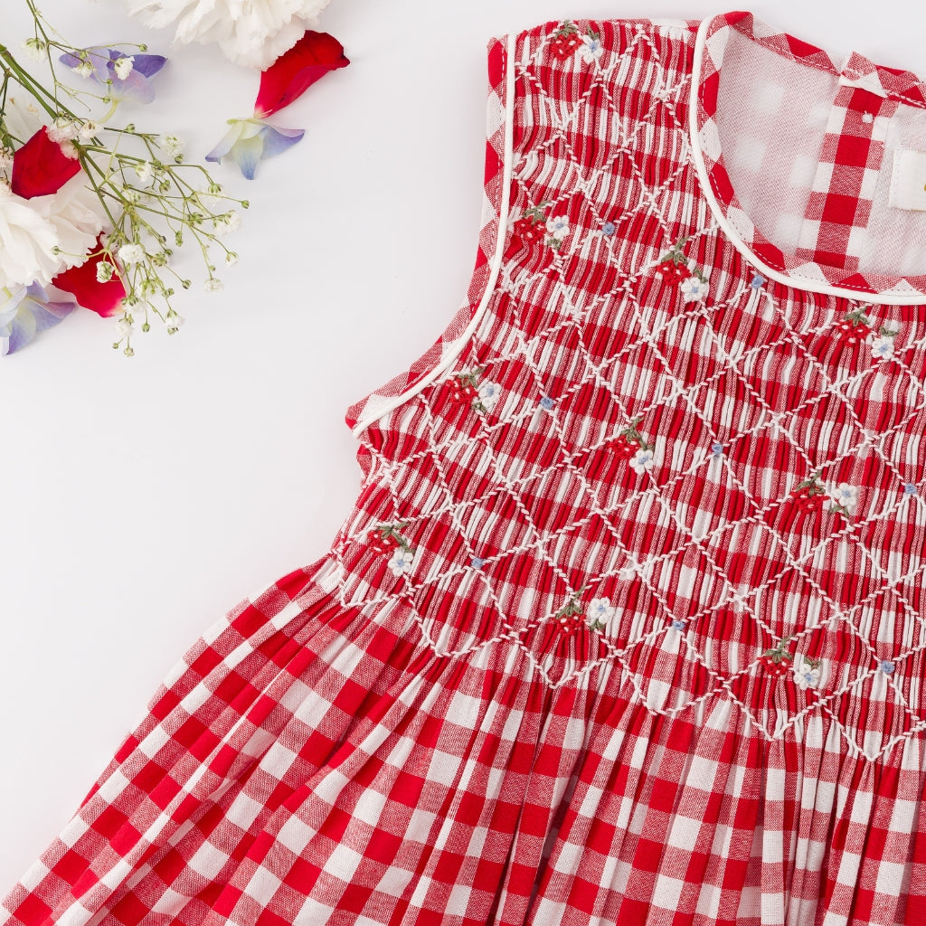 This dress runs true to US sizing. This features classic red-and-white checks with delicate hand-smocking across the bodice for a timeless, heirloom-inspired look. Finished with flutter sleeves and a softly gathered skirt, it’s perfect for both everyday wear and special occasions.