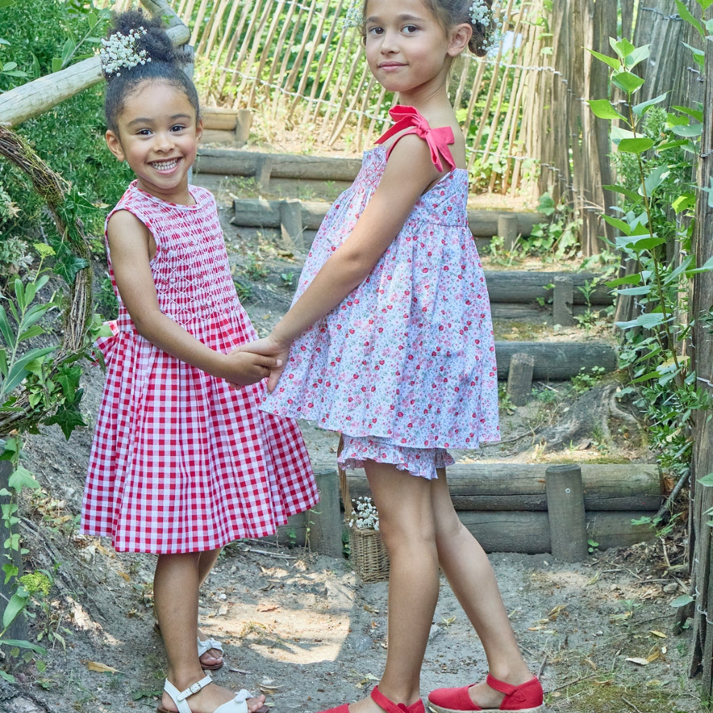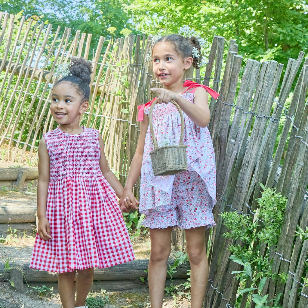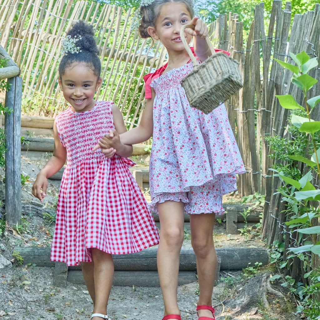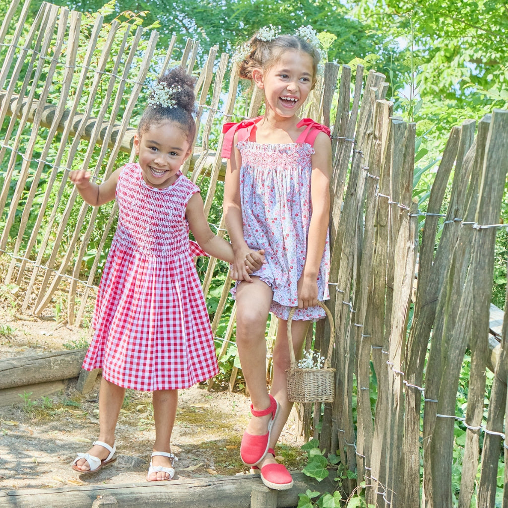 This dress runs true to US sizing. This features classic red-and-white checks with delicate hand-smocking across the bodice for a timeless, heirloom-inspired look. Finished with flutter sleeves and a softly gathered skirt, it’s perfect for both everyday wear and special occasions.