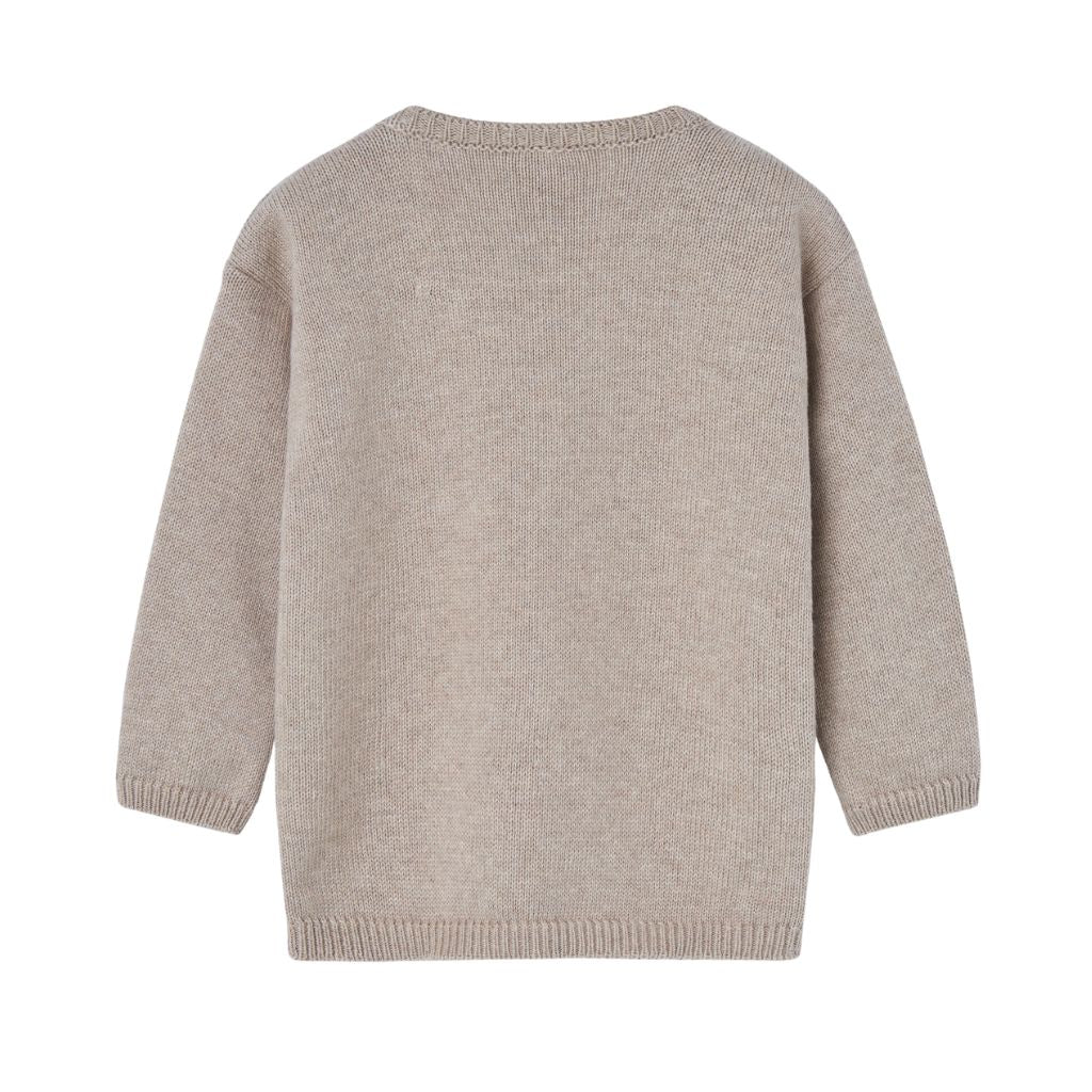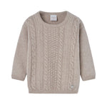 This sweater runs true to size. Wrap your little one in timeless comfort with this soft beige cable-knit sweater from Paz Rodríguez. Featuring intricate detailing and a cozy round neckline, it's perfect for layering on cooler days while maintaining a classic, elegant look.