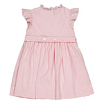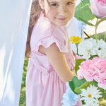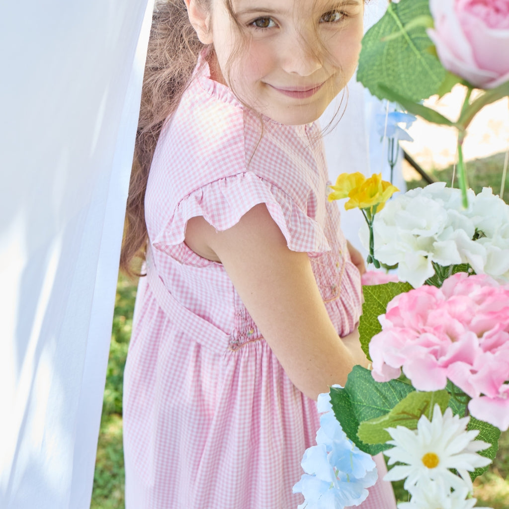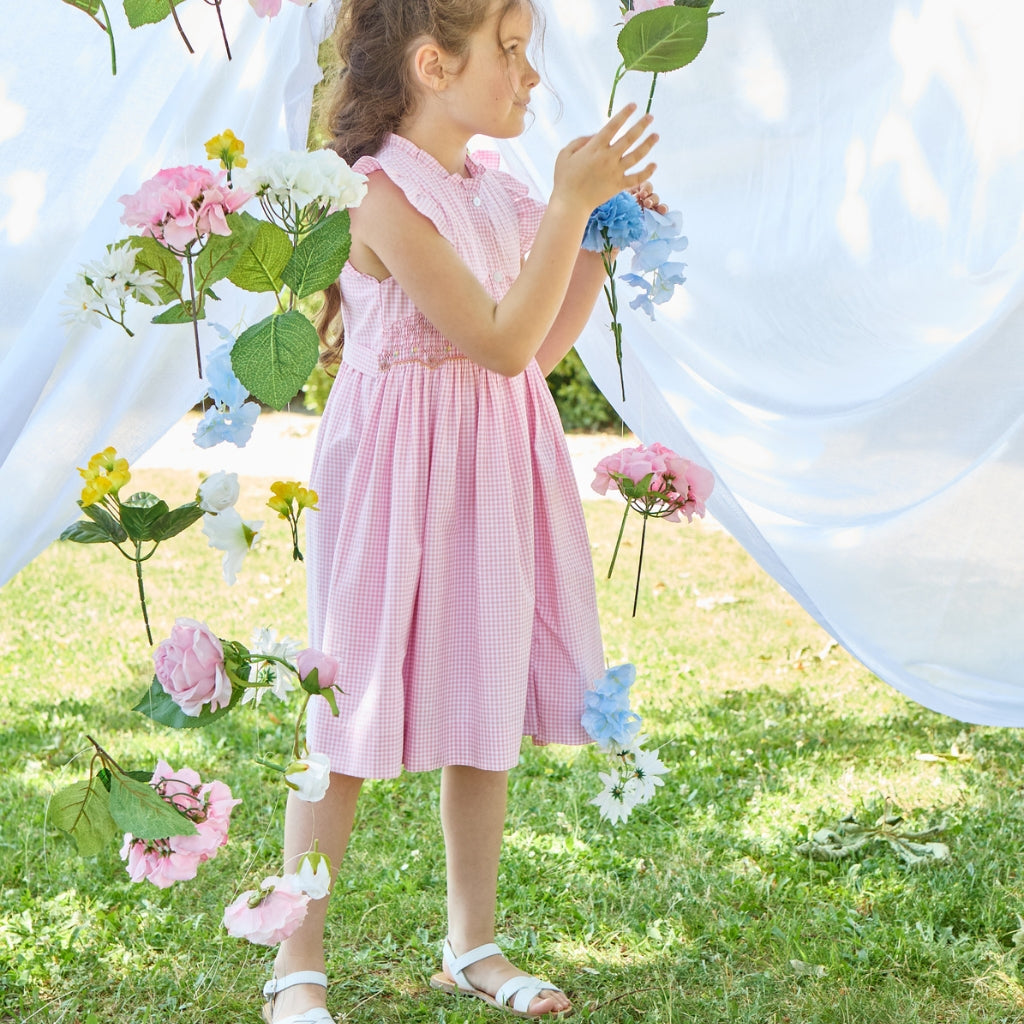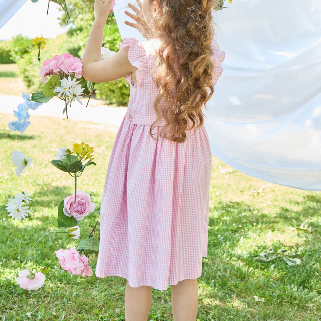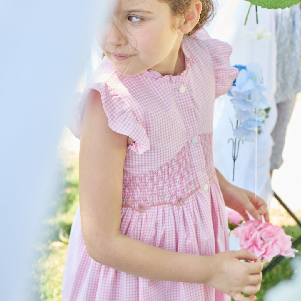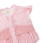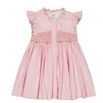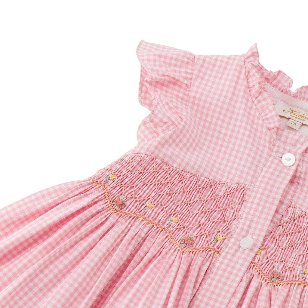 This dress runs true to US sizing. This classic gingham dress features soft pink checks with flutter sleeves, a ruffled neckline, and delicate hand-smocking accented with embroidered details across the bodice. Finished with a button-front closure and a full gathered skirt, it’s a timeless piece perfect for everyday wear or special moments.