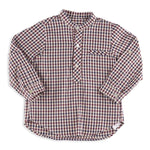 This garment is made of 100% cotton and fits true to size; we recommend purchasing the exact age for the perfect fit. If the child is in between ages we recommend purchasing the next age up for the perfect fit. The Mateo Long Sleeve Boy Shirt is no exception, crafted from super soft cotton oxford and printed with a charming burgundy check pattern. It features a stylish mandarin stand collar, a classic long-sleeve popover silhouette with mother of pearl buttons, and a classic centre box pleat for a relaxed fit that allows for a range of motion, perfect for little boys on the go. It has a curved hem and a single, rounded one-button cuff, with attached buttons at the elbow to roll up the sleeves for an alternative, more casual fit.
