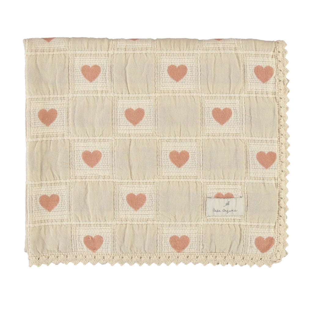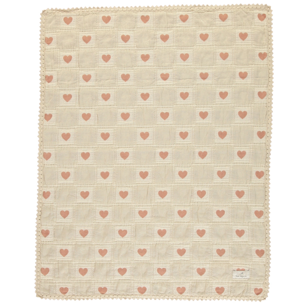 Wrap your little one in warmth and charm with this soft, vintage-style blanket featuring a delicate heart pattern in a faded rose hue. Handcrafted details and a scalloped crochet border add a timeless, heirloom-quality touch.