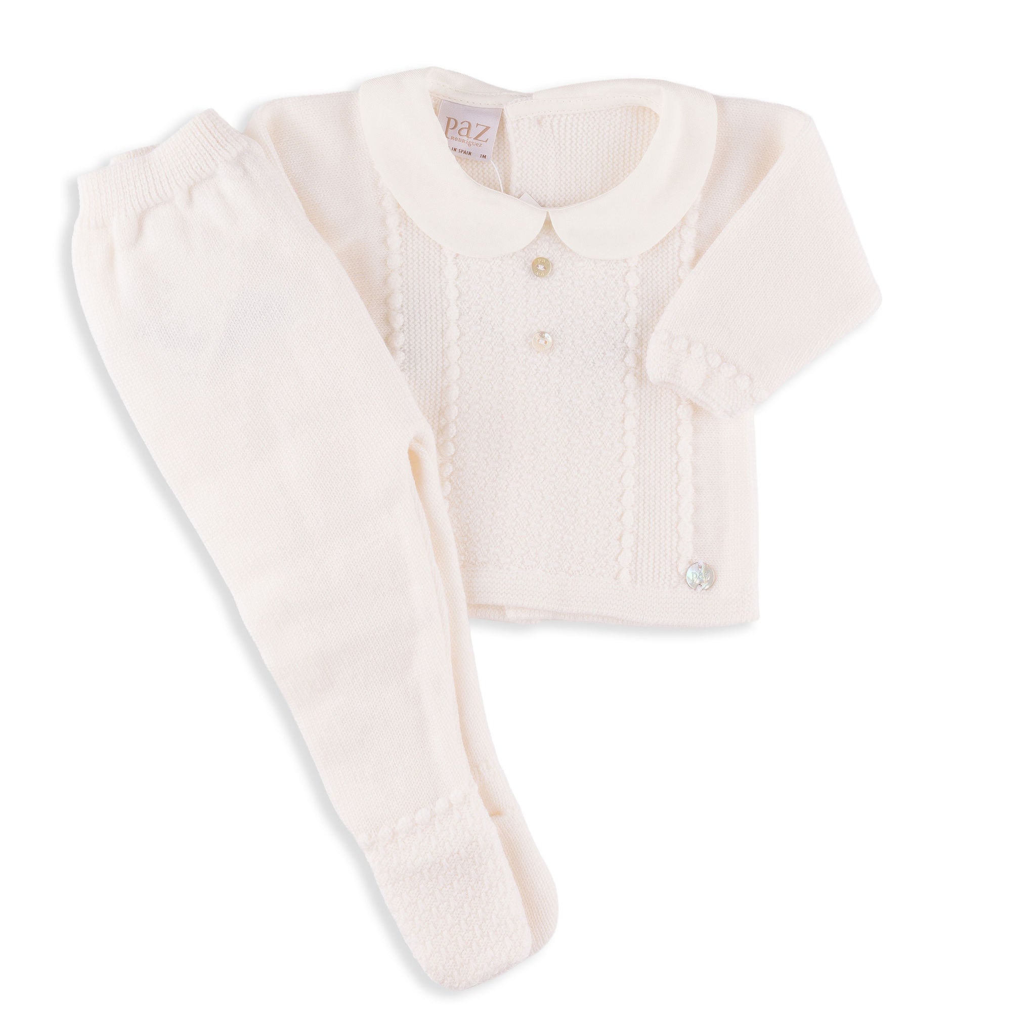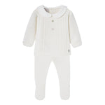 This elegant ivory knit baby set features a beautifully textured sweater with delicate detailing and a classic Peter Pan collar. Paired with cozy footed pants, it offers timeless charm and ultimate comfort for your little one.