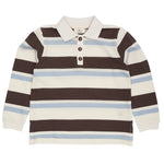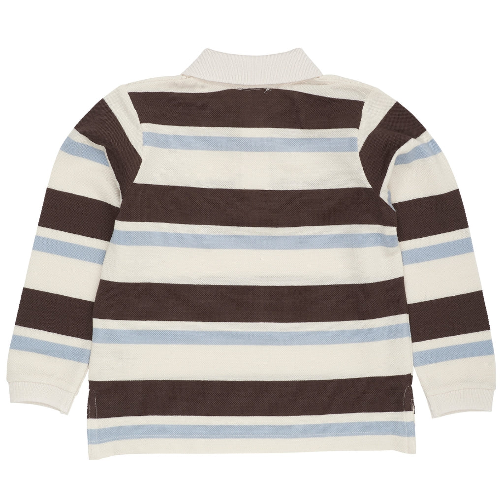 True to size / bordering on a touch generous! This long-sleeve rugby shirt features bold horizontal stripes in cream, brown, and light blue for a classic, sporty look. Designed with a soft collar and a three-button placket, it's a comfortable and stylish choice for everyday wear.