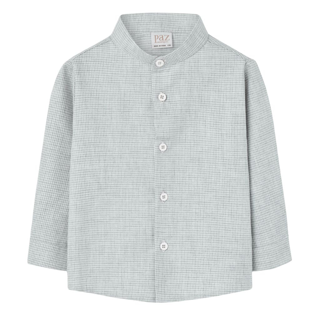 This refined long-sleeve shirt features a subtle green micro-check pattern and a modern band collar for a stylish, contemporary look. Made from lightweight, breathable fabric, it offers both comfort and elegance for any occasion.